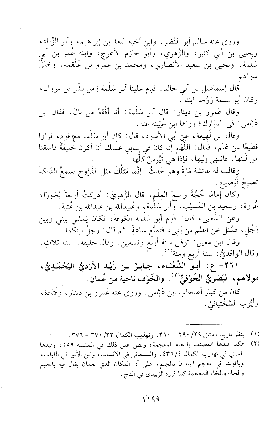 261 - ع: أَبُو الشَّعْثَاءِ، جَابِرُ بْنُ زَيْدٍ الأَزْدِيُّ الْيَحْمَدِيُّ، مَوْلاهُمُ، الْبَصْرِيُّ الْخَوْفِيُّ. [الوفاة: 91 - 100 ه]