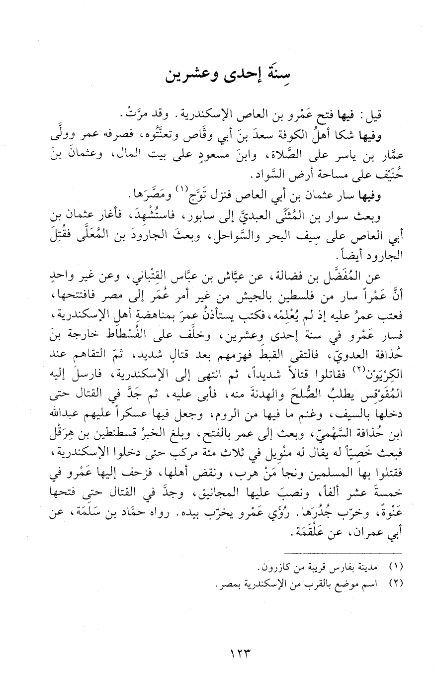 عَنِ الْمُفَضَّلِ بْنِ فَضَالَةَ، عَنْ عَيَّاشِ بْنِ عَبَّاسٍ الْقُتْبَانِيِّ، وَعَنْ غَيْرِ وَاحِدٍ أَنَّ عَمْرًا سَارَ مِنْ فِلَسْطِينَ بِالْجَيْشِ مِنْ غَيْرِ أَمْرِ عُمَرَ إِلَى مِصْرَ فَافْتَتَحَهَا، فَعَتَبَ عُمَرُ عَلَيْهِ إِذْ لَمْ يُعْلِمْهُ، فَكَتَبَ يَسْتَأْذِنُ عُمَرَ بِمُنَاهَضَةِ أَهْلِ الإِسْكَنْدَرِيَّةِ، فَسَارَ عَمْرٌو فِي سَنَةِ إِحْدًى وَعِشْرِينَ، وَخَلَّفَ عَلَى الْفُسْطَاطِ خَارِجَةَ بْنِ حُذَافَةَ الْعَدَوِيَّ، فَالْتَقَى الْقِبْطَ فَهَزَمَهُمْ بَعْدَ قِتَالٍ شَدِيدٍ، ثُمَّ الْتَقَاهُمْ عِنْدَ الْكِرْيَوْن فَقَاتَلُوا قِتَالًا شَدِيدًا، ثُمَّ انْتَهَى إِلَى الإِسْكَنْدَرِيَّةِ، فَأَرْسَلَ إِلَيْهِ الْمُقَوْقِسُ يَطْلُبُ الصُّلْحَ وَالْهُدْنَةَ مِنْهُ، فَأَبَى عَلَيْهِ، ثُمَّ جَدَّ فِي الْقِتَالِ حَتَّى دَخَلَهَا بِالسَّيْفِ، وَغَنِمَ مَا فِيهَا مِنَ الرُّومِ، وَجَعَلَ فِيهَا عَسْكَرًا عَلَيْهِمْ عَبْدُ اللَّهِ بْنُ حُذَافَةَ السَّهْمِيُّ، وَبَعَثَ إِلَى عُمَرَ بِالْفَتْحِ، وَبَلَغَ الْخَبَرُ قُسْطَنْطِينَ بْنَ هِرَقْلَ فَبَعَثَ خصيًّا لَهُ يُقَالُ لَهُ منْوِيل فِي ثَلاثِمِائَةِ مَرْكَبٍ حَتَّى دَخَلُوا الإِسْكَنْدَرِيَّةِ، فَقَتَلُوا بها الْمُسْلِمِينَ وَنَجَا مَنْ هَرَبَ، وَنَقَضَ أَهْلُهَا، فَزَحَفَ إِلَيْهَا عَمْرٌو فِي خَمْسَةَ عَشَرَ أَلْفًا، وَنَصَبَ عَلَيْهَا الْمَجَانِيقَ، وَجَدَّ فِي الْقِتَالِ حَتَّى فَتَحَهَا عَنْوَةً، وَخَرَّبَ جُدُرَهَا. رُؤِيَ عَمْرٌو يُخَرِّبُ بِيَدِهِ. رَوَاهُ حَمَّادُ بْنُ سَلَمَةَ، عَنْ أَبِي عِمْرَانَ، عن علقمة.