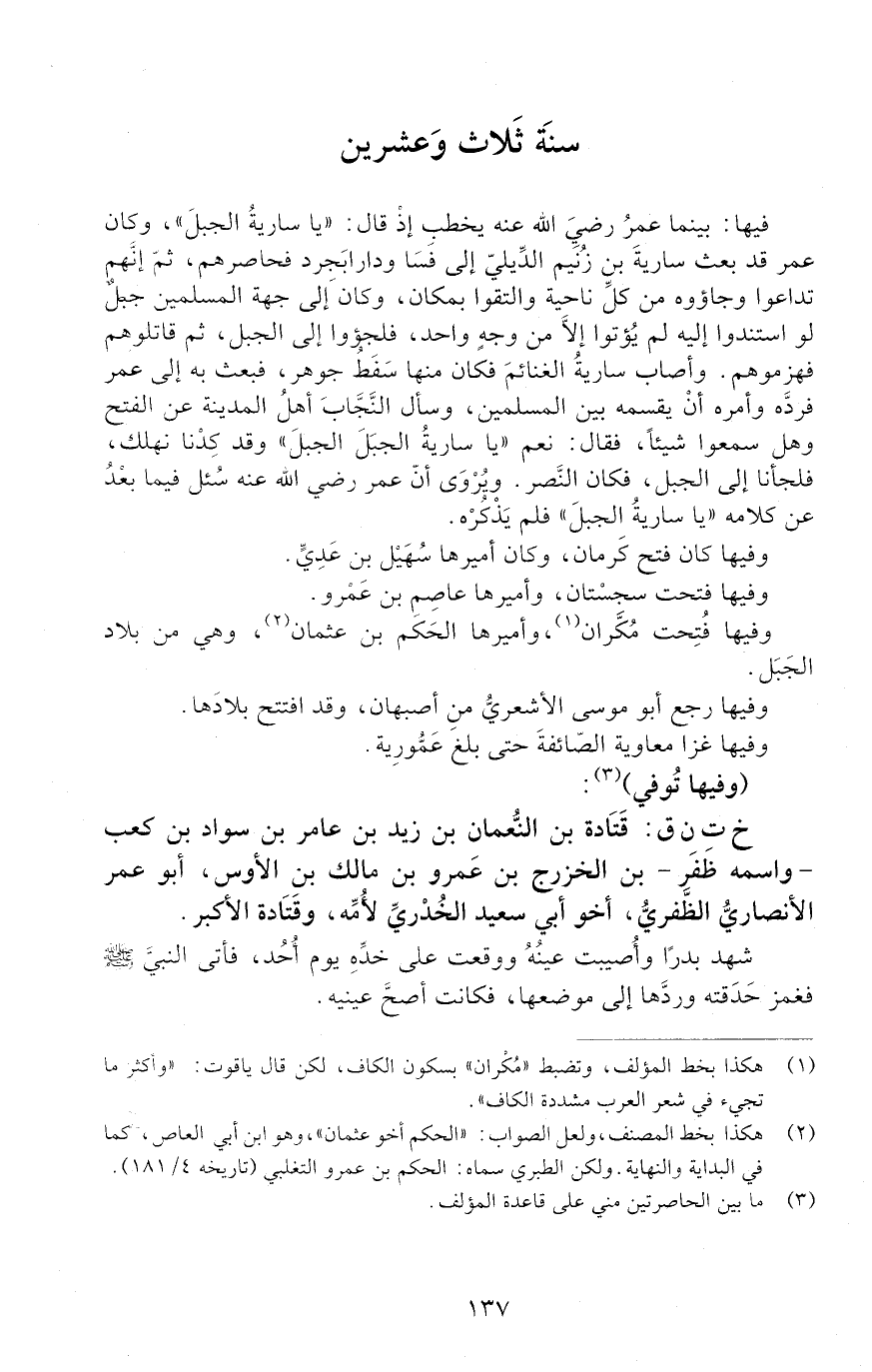 فيها: بينما عمر رضي الله عنه يخطب إذ قَالَ: " يا ساريةُ، الجبل "، وكان عمر قد بعث سارية بن زنيم الديلي إلى فسا ودارابجرد فحاصرهم، ثمّ إنّهم تداعوا وجاؤوه من كل ناحية والتقوا بمكان، وكان إلى جهة المُسْلِمين جبل لو استندوا إليه لم يؤتوا إلا من وجه واحد، فلجؤوا إلى الجبل، ثُمَّ قاتلوهم فهزموهم. وأصاب سارية الغنائم فكان منها سفط جوهر، فبعث به إلى عُمَر فردّه وأمره أن يقسّمه بين المُسْلِمين، وسأل النَّجّاب أهل المدينة عَنِ الفتح وهل سمعوا شيئًا، فَقَالَ: نعم " يا سارية، الجبل الجبلَ " وقد كِدْنا نهلك، فلجأنا إلى الجبل، فكان النّصر. وَيُرْوَى أنّ عمر رضي الله عنه سُئل فيما بعد عَنْ كلامه " يا سارية، الجبل " فلم يذكره.