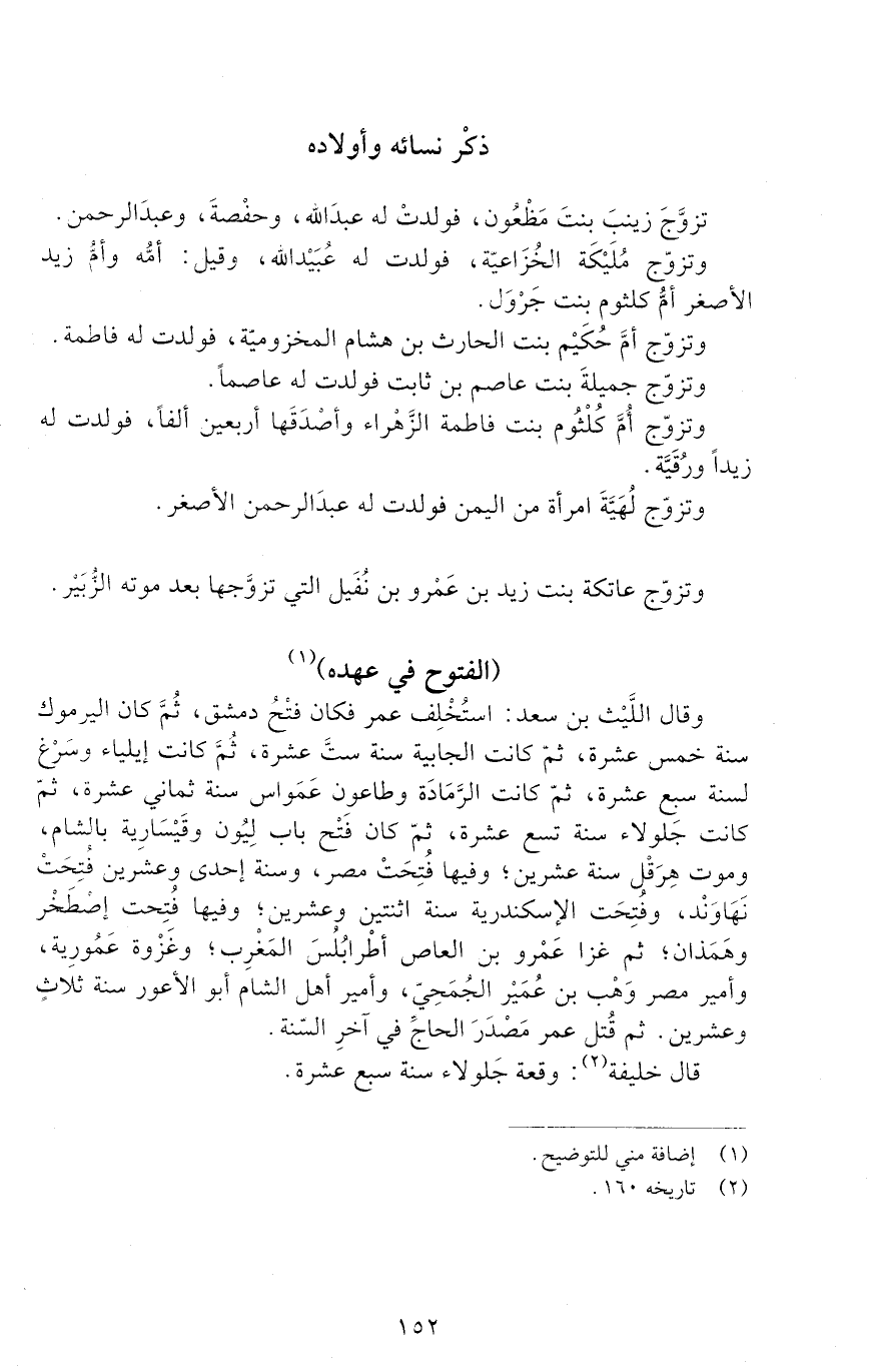 وَقَالَ الَّليْث بْن سعد: استُخْلِف عُمَر فكان فتْحُ دمشق، ثُمَّ كان اليرموك سنة خمس عشرة، ثُمَّ كانت الجابية سنة ست عشرة، ثُمَّ كانت إيلياء وسَرْغ لسنة سبع عشرة، ثمّ كانت الرَّمَادة وطاعون عَمَوَاس سنة ثماني عشرة، ثُمَّ كانت جلولاء سنة تسع عشرة، ثُمَّ كان فتح باب لِيُون وقَيْسَارِية بالشام، وموت هِرَقْلَ سنة عشرين، وفيها فُتحت مصر، وسنة إحدى وعشرين فُتِحَتْ نَهَاونْد، وفُتِحَت الإسكندرية سنة اثنتين وعشرين، وفيها فُتِحت إصْطَخر وهَمَذان، ثم غزا عمرو بْن العاص أطْرابُلُسَ المَغْرِب، وغَزْوة عَمُورية، وأمير مصر وهْب بْن عمير الجُمَحيّ، وأمير أهل الشام أَبُو الأعور سنة ثلاثٍ وعشرين. ثُمَّ قُتل عُمَر مَصْدَرَ الحاجّ في آخر السنة.