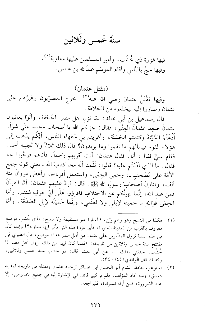 وفيها مَقْتَلُ عثمان رضي الله عنه: خرج المصرّيون وغيرهم على عثمان وصاروا إليه ليخلعوه من الخلافة.