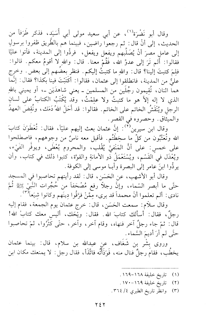 وَقَالَ سلّام: سمعت الحسن، قَالَ: خرج عثمان يوم الجمعة، فقام إليه رجل، فَقَالَ: أسألك كتاب الله، فقال: ويْحَك، أليس معك كتاب الله! قَالَ: ثمّ جاء رجلٌ آخر فنهاه، وقام آخر، وآخر، حتّى كَثُرُوا، ثمّ تحاصبوا حتّى لم أر أديمَ السماء.