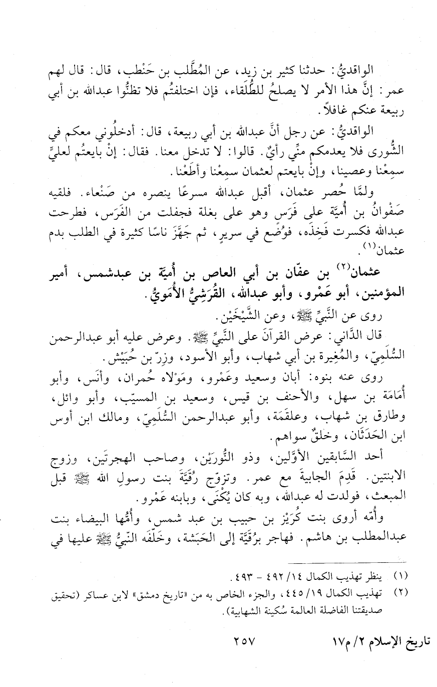 -عُثْمَانَ بْنِ عَفَّانَ بْنِ أَبِي الْعَاصِ بْنِ أُميَّة بْن عبد شمس، أمير المؤمنين، أَبُو عمرو، وأبو عبد الله، القُرَشيّ الأمويّ [المتوفى: 35 ه]