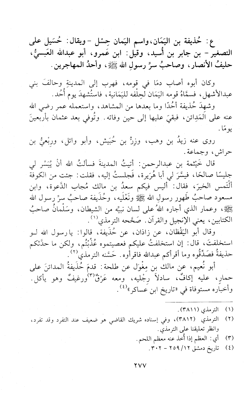 وحُذيْفة أحدُ أصحاب النّبيّ - صَلَّى اللَّهُ عَلَيْهِ وَسَلَّمَ - الأربعة عشر النُّجباء، كان النّبيّ - صَلَّى اللَّهُ عَلَيْهِ وَسَلَّمَ - أسرّ إليه أسماء المنافقين، وحفِظ عَنْهُ الْفِتَنَ التي تكون بين يدي السّاعة، وناشده عُمَر بالله: " أنا من المنافقين؟ " فقال: اللَّهُمَّ لَا، ولا أزكّي أحدًا بعدك.