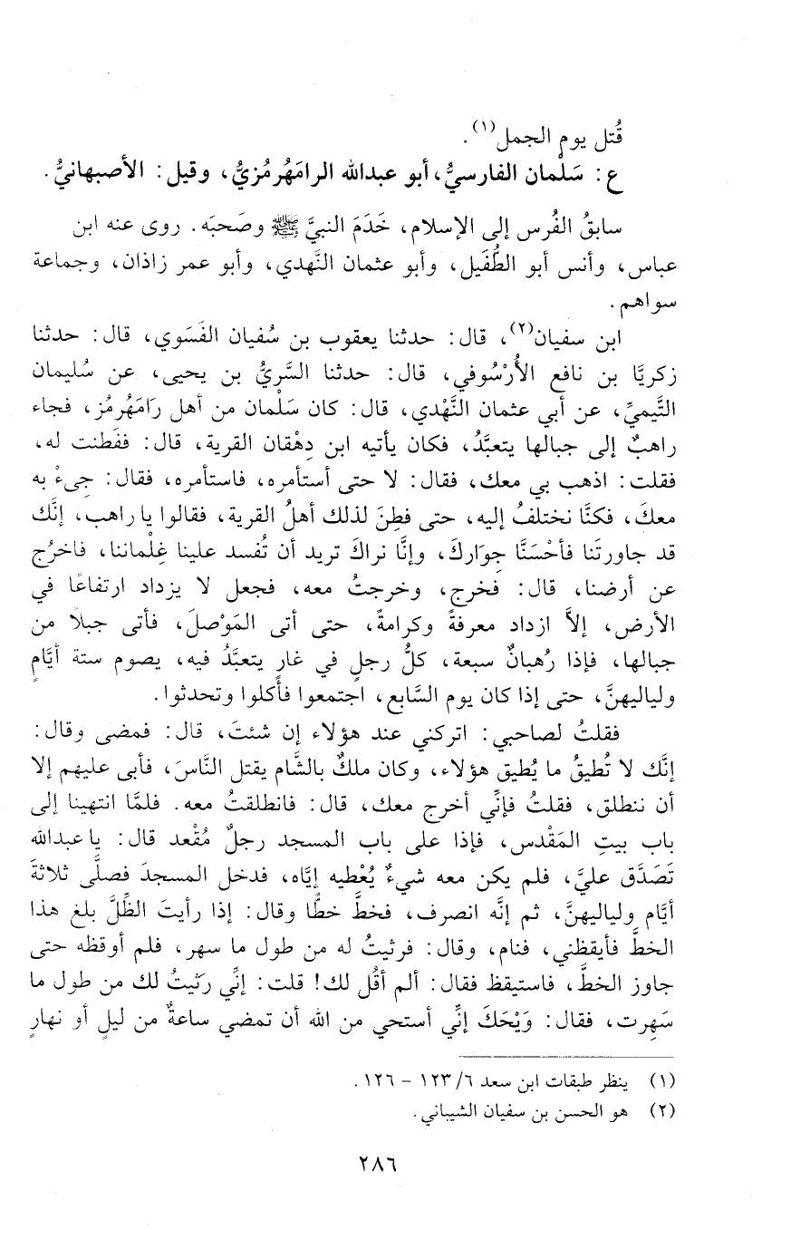 ابن سفيان: حدثنا يعقوب بن سفيان الفسوي، قال: حدثنا زكريا بن نافع الأرسوفي، قال: حدثنا السَّرِيّ بن يحيى، عَنْ سُلَيْمَانَ التَّيْمِيِّ، عَنْ أَبِي عُثْمَانَ النَّهْدِيِّ قَالَ: كان سَلْمان من أهل رامَهُرْمُز، فجاء راهبٌ إلى جبالها يتعبّد، فكان يأتيه ابن دِهْقان القرية، قَالَ: ففَطِنْت له، فَقُلْتُ: اذهب بي معك، فَقَالَ: لَا، حتّى أستأمِرُه، فاستأمره، فَقَالَ: جيء به معك، فكنّا نختلف إليه، حتّى فطِن لذلك أهل القرية، فقالوا: يا راهب، إنّك قد جاورْتَنا فأحْسَنّا جِوَارَك، وإنّا نراك تريد أن تُفْسِد علينا غِلماننا، فاخرُجْ عن أرضنا، قَالَ: فخرج، وخرجت معه، فجعل لَا يزداد ارتفاعًا في الأرض، إلّا ازداد معرفةً وكرامةً، حتّى أتى الموصل، فأتى جبلًا من جبالها، فإذا رُهْبانٌ سبعة، كلّ رجل في غارٍ يتعبد فيه، يصوم ستة أيام ولياليهن، حتى إذا كان يوم السابع، اجتمعوا فأكلوا وتحدّثوا.