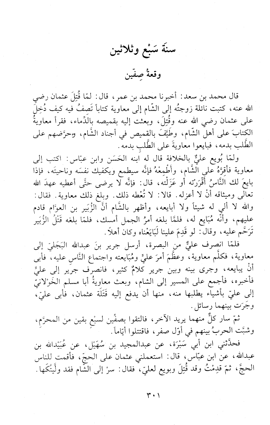 قُلْتُ: مَا هَذَا بِرَأْيِ، مُعَاوِيَةَ ابْنِ عَمِّ عُثْمَانَ وَعَامِلِهِ عَلَى الشَّامِ، وَلَسْتُ آمَنُ أَنْ يَضْرِبَ عُنُقِي بِعُثْمَانَ، وَأَدْنَى مَا هُوَ صَانِعٌ أَنْ يَحْبِسَنِي. قَالَ عَلِيٌّ: وَلِمَ؟ قُلْتُ: لِقَرَابَتِي مِنْكَ، وَأَنَّ كُلَّ مَنْ حَمَلَ عَلَيْكَ حَمَلَ عَلَيَّ، وَلَكِنِ اكْتُبْ إِلَى مُعَاوِيَةَ فَمُنَّهُ وَعِدْهُ. فأبى علي وقال: لا وَاللَّهِ لا كَانَ هَذَا أَبَدًا.