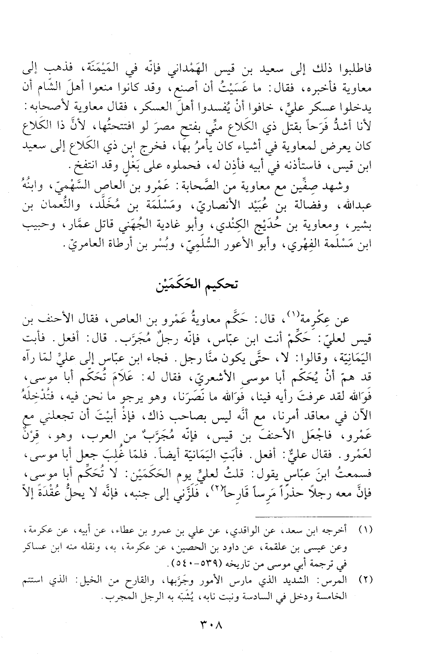 عن عِكْرِمة، قَالَ: حَكَّم مُعَاوِيَة عمرو بْن العاص، فقال الأحنف بن قيس لعلي: حكم أنت ابن عَبَّاس، فإنّه رجلٌ مُجَربّ، قَالَ: أفعل، فأبت الْيَمَانِيَةُ وقالوا: لَا، حتّى يكون منّا رَجُل، فجاء ابن عَبَّاس إِلَى عليّ لمّا رآه قد همّ أنْ يُحَكّم أَبَا مُوسَى الْأَشْعَرِيِّ، فقال له: عَلَام تُحَكّم أَبَا مُوسَى، فَوَالله لقد عرفت رأيه فينا، فَوَالله مَا نَصَرنا، وهو يرجو مَا نَحْنُ فِيهِ، فتُدْخِلَهُ الآن فِي معاقد أمرنا، مع أنّه ليس بصاحب ذاك، فإذْ أبيْتَ أن تجعلني مع عمرو فاجْعَل الأحنفَ بْن قَيْس، فإنّه مُجَرَّبٌ من العرب، وهو قِرْنٌ لعَمْرو. فقال عليّ: أفعل، فأبت اليَمَانِيَةُ أيضًا. فلمّا غُلِبَ جعل أَبَا مُوسَى، فسمعتُ ابن عَبَّاس يقول: قلتُ لعلي يوم الحَكَمَيْن: لَا تُحَكّم أَبَا مُوسَى، فإنّ معه رجلا حذرا مرسا قارحا، فلزَّني إِلَى جنبه، فإنّه لَا يحلّ عُقْدَةً إلا -[309]- عقدتُها ولا يَعْقِدُ عُقْدَةً إلّا حَلَلْتُها. قَالَ: يا ابن عَبَّاس مَا أصنع: إنّما أُوتَى من أصحابي، قد ضعفت نيتهم وكلُّوا فِي الحرب، هَذَا الأشعث بْن قَيْس يقول: لَا يكون فيها مُضَرِيّان أبدًا حَتَّى يكون أحدهما يمانٍ، قَالَ: فَعَذَرْتُهُ وعرفت أنه مُضْطَهَدٌ، وأنّ أصحابه لَا نيَّة لهم.