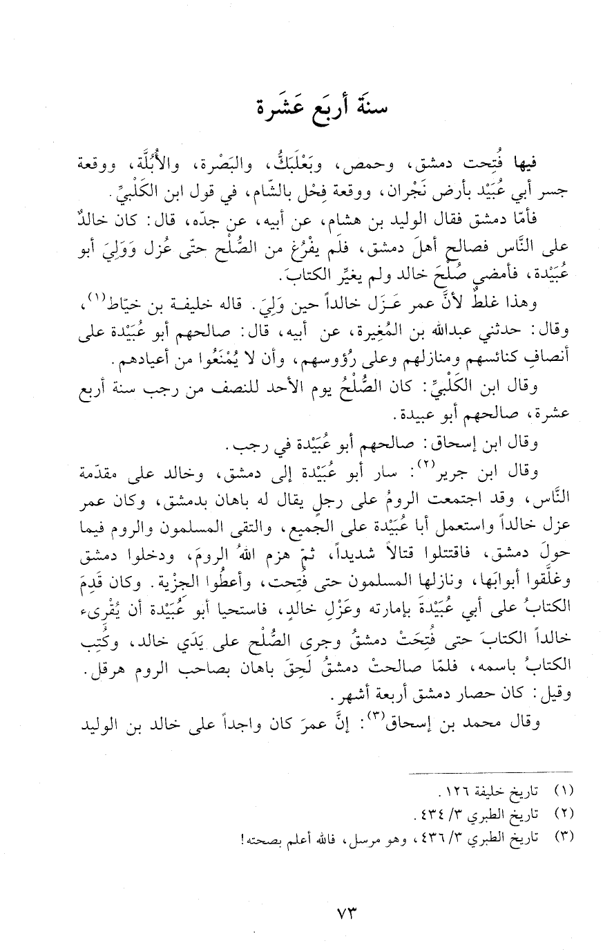 وَقَالَ ابن الكلبي: كان الصلح يوم الأحد للنّصف من رجب سنة أربع عشرة، صالحهم أبو عبيدة.
