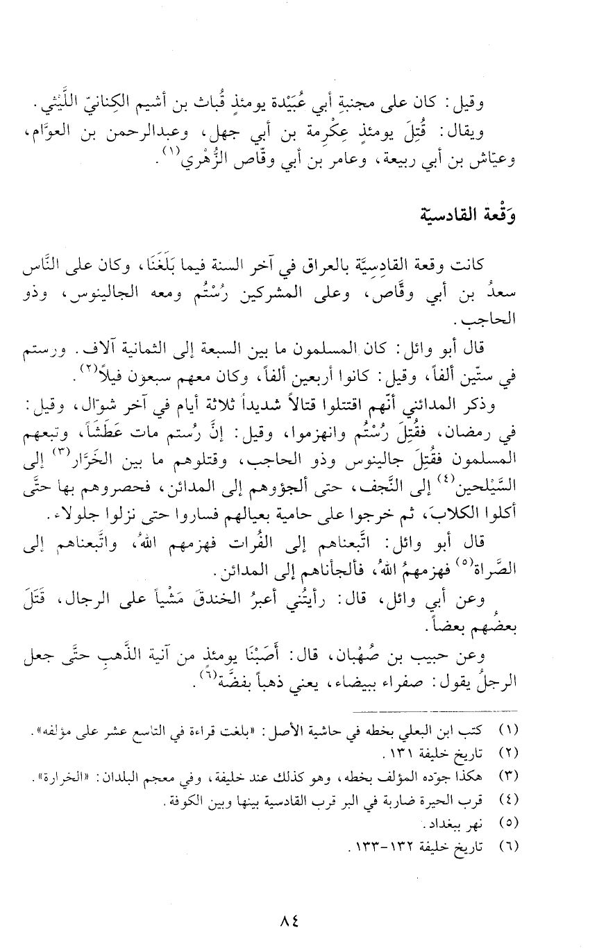 كانت وقعة القادسية بالعراق في آخر السنة فيما بَلَغَنَا، وكان على النَّاس سعد بْن أبي وقاص، وعلى المشركين رُسْتُم ومعه الجالينوس وذو الحاجب.