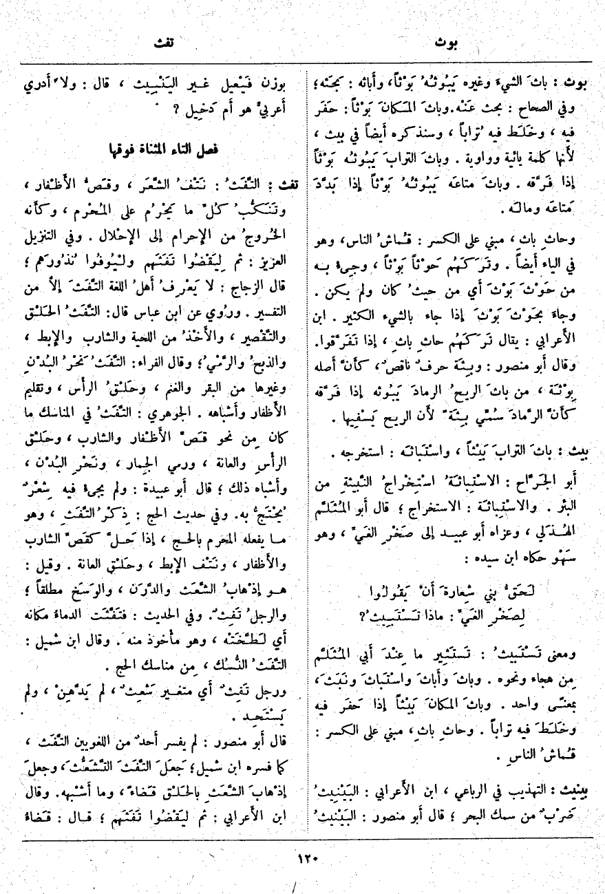 تفث: التَّفَثُ: نَتْفُ الشَّعَر، وقَصُّ الأَظْفار، وتَنَكُّبُ كُلِّ مَا يَحْرُم عَلَى المُحْرم، وكأَنه الخُروجُ مِنَ الإِحرام إِلى الإِحْلال. وَفِي التَّنْزِيلِ الْعَزِيزِ: ثُمَّ لْيَقْضُوا تَفَثَهُمْ وَلْيُوفُوا نُذُورَهُمْ