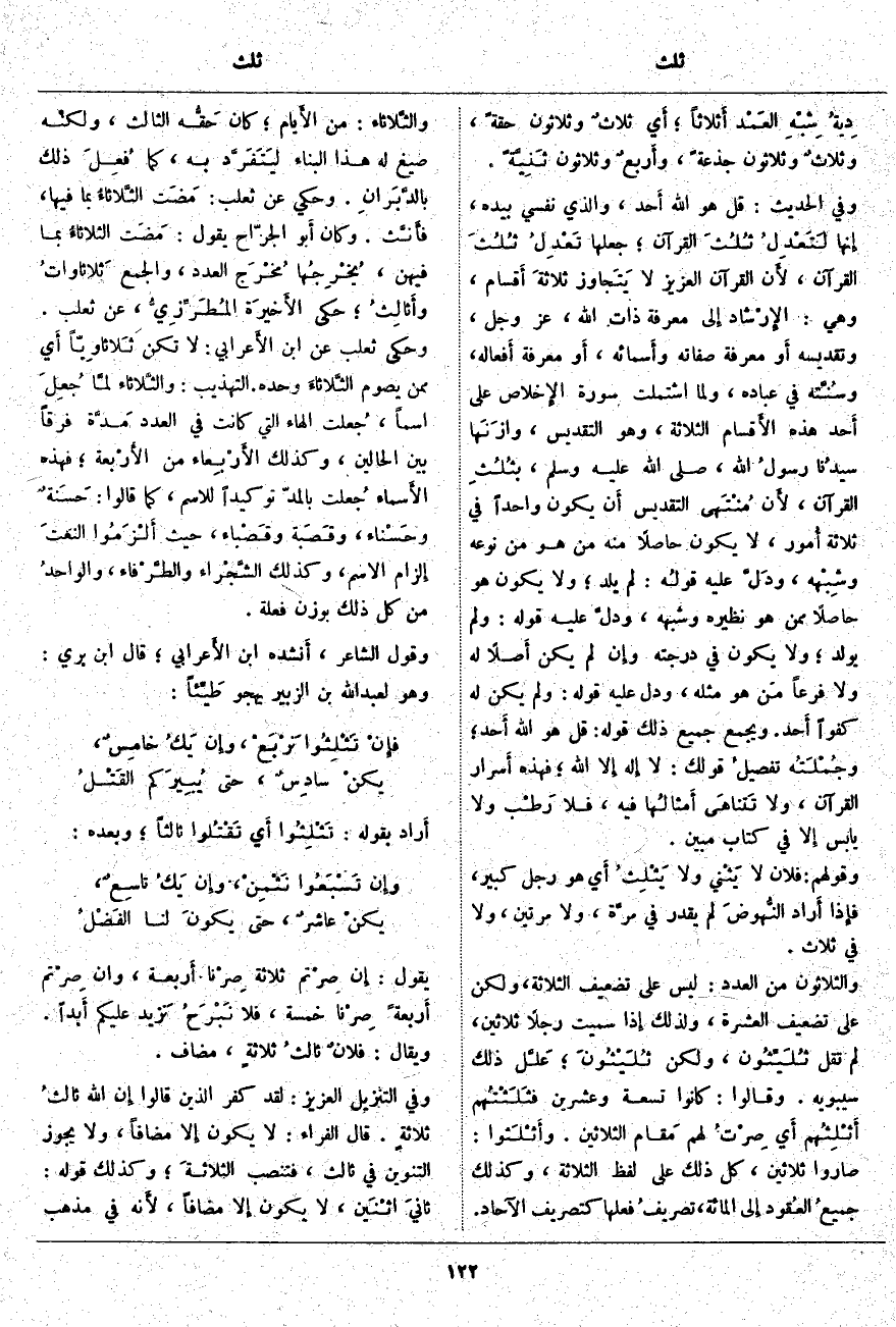 ؛ جَعَلَهَا تَعْدِلُ ثُلُثَ الْقُرْآنِ، لأَن الْقُرْآنَ الْعَزِيزَ لَا يَتَجاوز ثلاثةَ أَقسام، وَهِيَ: الإِرْشاد إِلى مَعْرِفَةِ ذَاتِ اللَّهِ، عَزَّ وَجَلَّ، وَتَقْدِيسِهِ أَو مَعْرِفَةِ صِفَاتِهِ وأَسمائه، أَو مَعْرِفَةِ أَفعاله، وسُنَّته فِي عِبَادِهِ، وَلَمَّا اشْتَمَلَتْ سُورَةُ الإِخلاص عَلَى أَحد هَذِهِ الأَقسام الثَّلَاثَةِ، وَهُوَ التَّقْدِيسُ، وازَنَها سيدُنا رسولُ اللَّهِ، صَلَّى اللَّهُ عَلَيْهِ وَسَلَّمَ، بثُلُثِ الْقُرْآنِ، لأَن مُنْتَهى التَّقْدِيسِ أَن يَكُونَ وَاحِدًا فِي ثَلَاثَةِ أُمور، لَا يَكُونُ حَاصِلًا مِنْهُ مَنْ هُوَ مِنْ نَوْعِهِ وشِبْهه، ودَلَّ عَلَيْهِ قولُه: لَمْ يَلِدْ؛ وَلَا يَكُونُ هُوَ حَاصِلًا مِمَّنْ هُوَ نَظِيرُهُ وشبهه، ودلَّ عليه قوله: وَلَمْ يُولَدْ؛ وَلَا يَكُونُ فِي دَرَجَتِهِ وإِن لَمْ يَكُنْ أَصلًا لَهُ وَلَا فَرْعًا مَن هُوَ مِثْلُهُ، وَدَلَّ عَلَيْهِ قَوْلُهُ: وَلَمْ يَكُنْ لَهُ كُفُواً أَحَدٌ. وَيَجْمَعُ جَمِيعَ ذَلِكَ قَوْلُهُ: قُلْ هُوَ اللَّهُ أَحَدٌ؛ وجُمْلَتُه تفصيلُ قَوْلِكَ: لَا إِله إِلا اللَّهُ؛ فَهَذِهِ أَسرار الْقُرْآنِ، وَلَا تَتناهَى أَمثالُها فِيهِ، فَلَا رَطْب وَلَا يَابِسَ إِلا فِي كِتَابٍ مُبِينٍ. وَقَوْلُهُمْ: فُلَانٌ لَا يَثْني وَلَا يَثْلِثُ أَي هُوَ رَجُلٌ كَبِيرٌ، فإِذا أَراد النُّهوضَ لَمْ يَقْدِرْ فِي مرَّة، وَلَا مَرَّتَيْنِ، وَلَا فِي ثَلَاثٍ. وَالثَّلَاثُونَ مِنَ الْعَدَدِ: لَيْسَ عَلَى تَضْعِيفِ الثَّلَاثَةِ، وَلَكِنْ عَلَى تَضْعِيفِ الْعَشَرَةِ، وَلِذَلِكَ إِذا سَمَّيْتَ رَجُلًا ثَلَاثِينَ، لَمْ تَقُلْ ثُلَيِّثُون، وَلَكِنْ ثُلَيْثُونَ؛ عَلَّل ذَلِكَ سِيبَوَيْهِ. وَقَالُوا: كَانُوا تِسْعَةً وَعِشْرِينَ فثَلَثْتُهم أَثْلِثُهم أَي صِرْتُ لَهُمْ مَقام الثَّلَاثِينَ. وأَثْلَثوا: صَارُوا ثَلَاثِينَ، كُلُّ ذَلِكَ عَلَى لَفْظِ الثَّلَاثَةِ، وَكَذَلِكَ جميعُ العُقود إِلى الْمِائَةِ، تصريفُ فِعْلِهَا كَتَصْرِيفِ الْآحَادِ. والثَّلاثاء: مِنَ الأَيام؛ كَانَ حَقُّه الثَّالِثَ، ولكنَّه صِيغَ لَهُ هَذَا الْبِنَاءُ ليَتَفَرَّد بِهِ، كَمَا فُعِلَ ذَلِكَ بالدَّبَرانِ. وَحُكِيَ عَنْ ثَعْلَبٍ: مَضَت الثَّلاثاءُ بِمَا فِيهَا فأَنَّث. وَكَانَ أَبو الْجَرَّاحِ يَقُولُ: مَضَت الثلاثاءُ بِمَا فِيهِنَّ، يُخْرِجُها مُخْرَج الْعَدَدِ، وَالْجَمْعُ ثَلاثاواتُ وأَثالِثُ؛ حَكَى الأَخيرَة المُطَرِّزِيُّ، عَنْ ثَعْلَبٍ. وَحَكَى ثَعْلَبٌ عَنِ ابْنِ الأَعرابي: لَا تَكُنْ ثَلاثاوِيّاً أَي مِمَّنْ يَصُومُ الثَّلاثاءَ وَحْدَهُ. التَّهْذِيبِ: والثَّلاثاء لمَّا جُعِلَ اسْمًا، جُعلت الْهَاءُ الَّتِي كَانَتْ فِي الْعَدَدِ مَدَّة فَرْقًا بَيْنَ الْحَالَيْنِ، وَكَذَلِكَ الأَرْبِعاء مِنَ الأَرْبعة؛ فَهَذِهِ الأَسماء جُعلت بِالْمَدِّ تَوْكِيدًا لِلِاسْمِ، كَمَا قَالُوا: حَسَنةٌ وحَسْناء، وقَصَبة وقَصْباء، حَيْثُ أَلْزَمُوا النعتَ إِلزام الِاسْمِ، وَكَذَلِكَ الشَّجْراء والطَّرْفاء، والواحدُ مِنْ كُلِّ ذَلِكَ بِوَزْنِ فَعَلَةٍ. وَقَوْلُ الشَّاعِرِ، أَنشده ابْنُ الأَعرابي؛ قَالَ ابْنُ بَرِّيٍّ: وَهُوَ لِعَبْدِ اللَّهِ بْنِ الزُّبَيْرِ يَهْجُو طَيِّئاً: