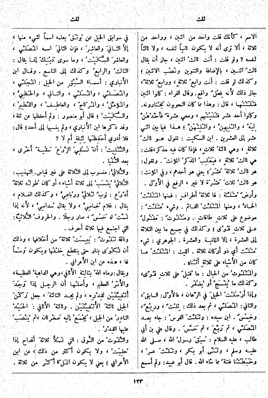 قَالَ أَبو عُبَيْدٍ: وَلَمْ أَسمع فِي سَوَابِقِ الْخَيْلِ مِمَّنْ يُوثَقُ بِعِلْمِهِ اسْمًا لِشَيْءٍ مِنْهَا، إِلَّا الثانيَ والعاشِرَ، فإِن الثانيَ اسْمُهُ المُصَلِّي، والعاشرَ السُّكَيْتُ، وَمَا سِوَى ذَيْنِكَ إِنما يُقَالُ: الثالثُ والرابعُ وَكَذَلِكَ إِلى التَّاسِعِ. وَقَالَ ابْنُ الأَنباري: أَسماءُ السُّبَّقِ مِنَ الْخَيْلِ: المُجَلِّي، والمُصَلِّي، والمُسَلِّي، وَالتَّالِي، والحَظِيُّ، والمُؤمِّلُ، والمُرْتاحُ، والعاطِفُ، واللَّطِيمُ، والسُّكَيْتُ؛ قَالَ أَبو مَنْصُورٍ: وَلَمْ أَحفظها عَنْ ثِقَةٍ، وَقَدْ ذَكَرَهَا ابْنُ الأَنباري، وَلَمْ يَنْسُبْهَا إِلى أَحد؛ قَالَ: فَلَا أَدري أَحَفِظَها لِثِقةٍ أَم لَا؟ والتَّثْلِيثُ: أَنْ تَسْقِيَ الزَّرْعَ سَقْيةً أُخْرى، بَعْدَ الثُّنْيا. والثُّلاثيُّ: منسوب إِلى الثَّلاثة عَلَى غَيْرِ قِيَاسٍ. التَّهْذِيبِ: الثُّلاثيُّ يُنْسَبُ إِلى ثَلَاثَةِ أَشياء، أَو كَانَ طُولُه ثلاثةَ أَذْرُع: ثوبٌ ثُلاثيٌّ ورُباعِيٌّ، وَكَذَلِكَ الْغُلَامُ، يُقَالُ: غُلَامٌ خُماسِيٌّ، وَلَا يُقَالُ سُداسِيٌّ، لأَنه إِذا تَمَّتْ لَهُ خَمْسٌ، صَارَ رَجُلًا. والحروفُ الثُّلاثيَّة: الَّتِيِ اجْتَمَعَ فِيهَا ثَلَاثَةُ أَحرف. وَنَاقَةٌ ثَلُوثٌ: يَبِسَتْ ثلاثةٌ مِنْ أَخْلافها، وَذَلِكَ أَن تُكْوَى بِنَارٍ حَتَّى يَنْقَطِعَ خِلْفُها وَيَكُونُ وَسْماً لَهَا، هَذِهِ عَنِ ابْنِ الأَعرابي. وَيُقَالُ: رَمَاهُ اللهُ بثالِثةِ الأَثافي، وَهِيَ الداهيةُ الْعَظِيمَةُ، والأَمْرُ الْعَظِيمُ، وأَصلُها أَن الرَّجُلَ إِذا وَجَدَ أُثْفِيَّتَيْن لقِدْرهِ، وَلَمْ يَجِدِ الثالثةَ، جَعَلَ رُكْنَ الْجَبَلِ ثالثةَ الأُثْفِيَّتَيْن. وثالثةُ الأَثافي: الحَيْدُ النادِرُ مِنَ الْجَبَلِ، يُجْمَعُ إِليه صَخْرتان، ثُمَّ يُنْصَبُ عَلَيْهَا القِدْرُ. والثَّلُوثُ مِنَ النُّوق: الَّتِي تَمْلأُ ثلاثةَ أَقداح إِذا حُلِبَتْ، وَلَا يَكُونُ أَكثر مِنْ ذَلِكَ، عَنِ ابْنِ الأَعرابي؛ يَعْنِي لَا يَكُونُ المَلْءُ أَكثَر مِنْ ثَلَاثَةٍ.