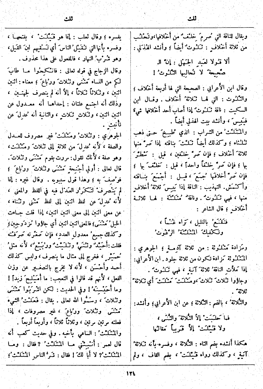 هَكَذَا أَنشده بِضَمِّ الثَّاءِ: الثُّلاثة، وَفَسَّرَهُ بأَنه ثَلاثةُ آنيةٍ، وَكَذَلِكَ رَوَاهُ قُيِّلَتْ، بِضَمِّ الْقَافِ، وَلَمْ يُفَسِّرْهُ؛ وَقَالَ ثَعْلَبٌ: إِنما هُوَ قَيَّلَتْ، بِفَتْحِهَا، وَفَسَّرَهُ بأَنها الَّتِي تُقَيِّلُ الناسَ أَي تَسْقيهم لبنَ القَيل، وَهُوَ شُرْبُ النَّهَارِ فَالْمَفْعُولُ، عَلَى هَذَا مَحْذُوفٌ. وَقَالَ الزَّجَّاجُ فِي قَوْلِهِ تَعَالَى: فَانْكِحُوا مَا طابَ لَكُمْ مِنَ النِّساءِ مَثْنى وَثُلاثَ وَرُباعَ