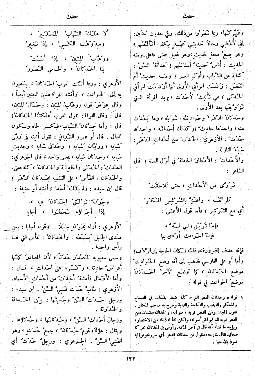 الأَزهري: وَرُبَّمَا أَنَّثت العربُ الحَدَثانَ، يَذْهَبُونَ بِهِ إِلى الحَوادث، وأَنشد الفراءُ هَذَيْنِ الْبَيْتَيْنِ أَيضاً، وَقَالَ عِوَضَ قَوْلِهِ ووهَّابُ المِئين: وحَمَّالُ المِئين، قَالَ: وَقَالَ الفراءُ: تَقُولُ الْعَرَبُ أَهلكتْنا الحَدَثانُ؛ قَالَ: وأَما حِدْثانُ الشَّباب، فَبِكَسْرِ الحاءِ وَسُكُونِ الدَّالِ. قَالَ أَبو عَمْرٍو الشَّيباني: تَقُولُ أَتيته فِي رُبَّى شَبابه، ورُبَّانِ شَبابه، وحُدْثى شَبَابِهِ، وحديثِ شَبَابِهِ، وحِدْثان شَبَابِهِ، بِمَعْنًى وَاحِدٍ؛ قَالَ الْجَوْهَرِيُّ: الحَدَثُ والحُدْثى والحادِثَةُ والحَدَثانُ، كُلُّهُ بِمَعْنًى. والحَدَثان: الفَأْسُ، عَلَى التَّشْبِيهِ بحَدَثان الدَّهْر؛ قَالَ ابْنُ سِيدَهْ: وَلَمْ يَقُلْهُ أَحَدٌ؛ أَنشد أَبو حَنِيفَةَ: