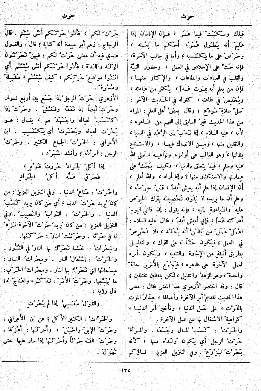والحَرْثُ: مَتاعُ الدُّنْيَا. وَفِي التَّنْزِيلِ الْعَزِيزِ: مَنْ كانَ يُرِيدُ حَرْثَ الدُّنْيا