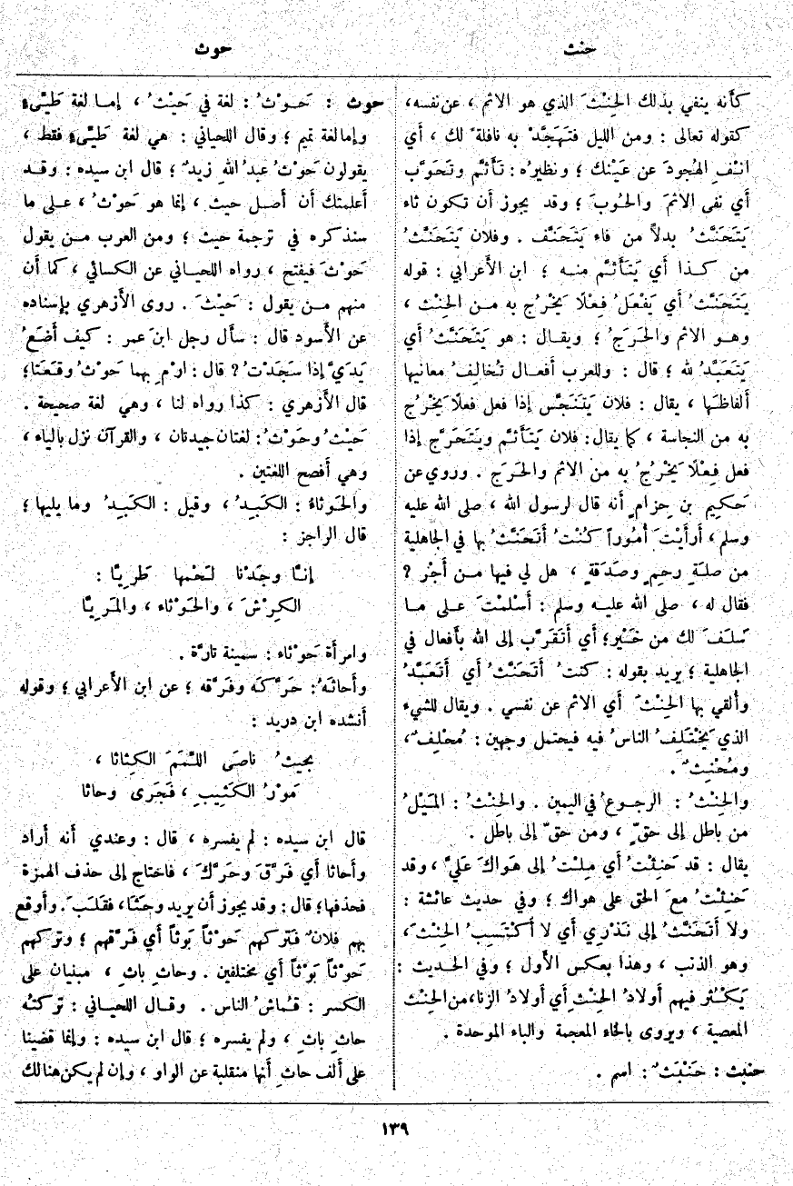 ؛ أَي أَتَقَرَّب إِلى اللَّهِ بأَفعال فِي الْجَاهِلِيَّةِ؛ يُرِيدُ بِقَوْلِهِ: كنتُ أَتَحَنَّثُ أَي أَتَعَبَّدُ وأُلقي بِهَا الحِنْثَ أَي الإِثم عَنْ نَفْسِي. وَيُقَالُ لِلشَّيْءِ الَّذِي يَخْتَلِفُ الناسُ فِيهِ فَيَحْتَمِلُ وَجْهَيْنِ: مُحْلِفٌ، ومُحْنِثٌ. والحِنْثُ: الرجوعُ فِي الْيَمِينِ. والحِنْثُ: المَيْلُ مِنْ بَاطِلٍ إِلى حقٍّ، وَمِنْ حَقٍّ إِلى بَاطِلٍ. يُقَالُ: قَدْ حَنِثْتُ أَي مِلْتُ إِلى هَواكَ عَليَّ، وَقَدْ حَنِثْتُ معَ الْحَقِّ عَلَى هَوَاكَ؛ وَفِي حَدِيثِ