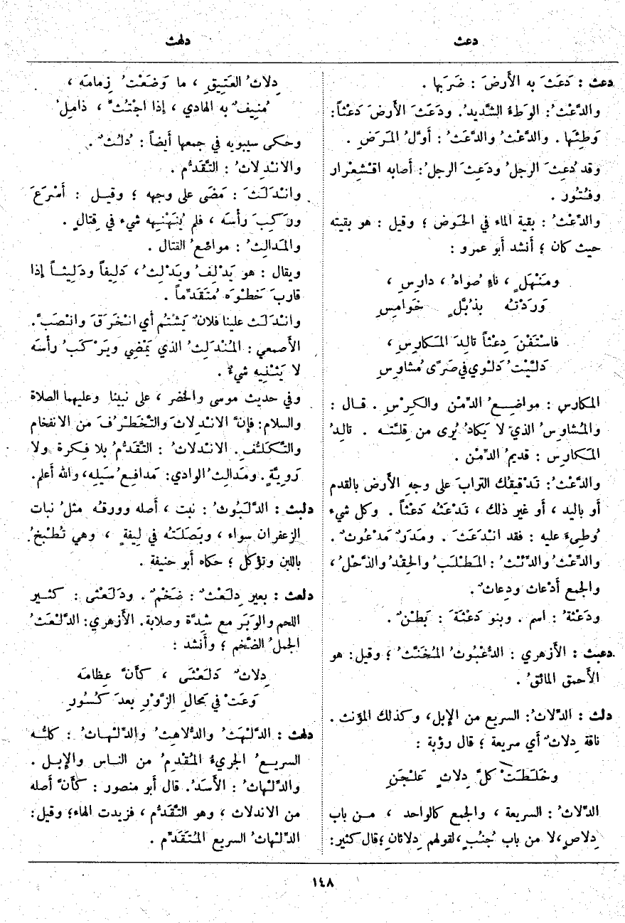 دلهث: الدَّلْهَثُ والدُّلاهِثُ والدِّلْهاثُ: كلُّه السريعُ الجريءُ المُقْدِمُ مِنَ النَّاسِ والإِبل. والدِّلْهاثُ: الأَسَدُ. قَالَ أَبو مَنْصُورٍ: كأَنَّ أَصله مِنَ الِانْدِلَاثِ، وَهُوَ التَّقَدُّم، فَزِيدَتِ الْهَاءُ؛ وَقِيلَ: الدِّلْهاثُ السَّرِيعُ المُتَقَدِّم.