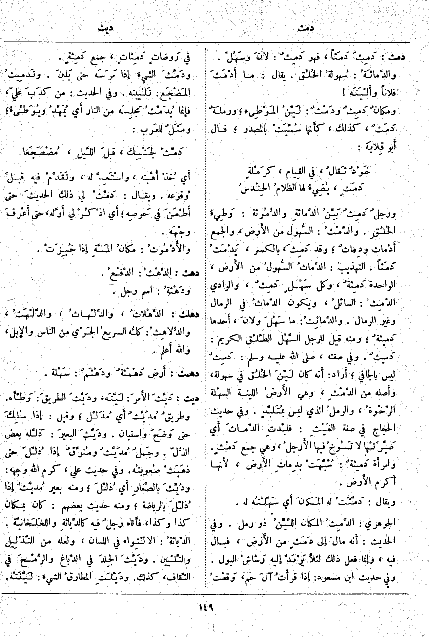 أَي صَيَّرَتْها لَا تَسُوخُ فِيهَا الأَرجلُ، وَهِيَ جَمْعُ دَمْثٍ. وامرأَة دَميثةٌ: شُبِّهَتْ بدِماثِ الأَرض، لأَنها أَكرم الأَرض. وَيُقَالُ: دَمَّثْتُ لَهُ المَكانَ أَي سَهَّلْتُه لَهُ. الْجَوْهَرِيُّ: الدَّمِثُ الْمَكَانُ اللَّيِّنُ ذُو رَمْلٍ. وَفِي الْحَدِيثِ: