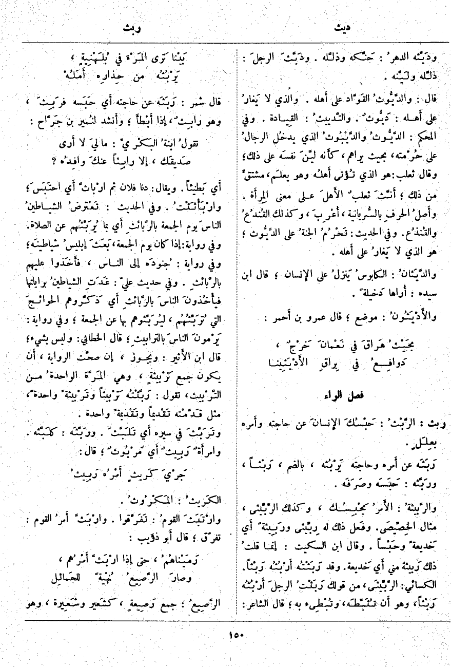 ربث: الرَّبْثُ: حَبْسُكَ الإِنسانَ عَنْ حَاجَتِهِ وأَمره بعِلَلٍ. رَبَثَه عَنْ أَمره وَحَاجَتِهِ يَرْبُثه، بِالضَّمِّ، رَبْثاً، ورَبَّثه: حَبَسَه وصَرَفَه. والرَّبيثةُ: الأَمرُ يَحْبِسُك، وَكَذَلِكَ الرِّبِّيثى، مِثَالُ الخِصِّيصَى. وَفَعَلَ ذَلك لَهُ رِبِّيثى ورَبِيثةً أَي خَديعةً وحَبْساً. وَقَالَ ابْنُ السِّكِّيتِ: إِنما قلتُ ذَلِكَ رَبيثة مِنِّي أَي خَديعة. وَقَدْ رَبَثْتُه أَرْبُثُه رَبْثاً. الْكِسَائِيُّ: الرِّبِّيثَى، مِنْ قَوْلِكَ رَبَثْتُ الرجلَ أَرْبُثُه رَبْثاً، وَهُوَ أَن تُثَبِّطَه، وتُبْطِئ بِهِ، قَالَ الشَّاعِرُ: