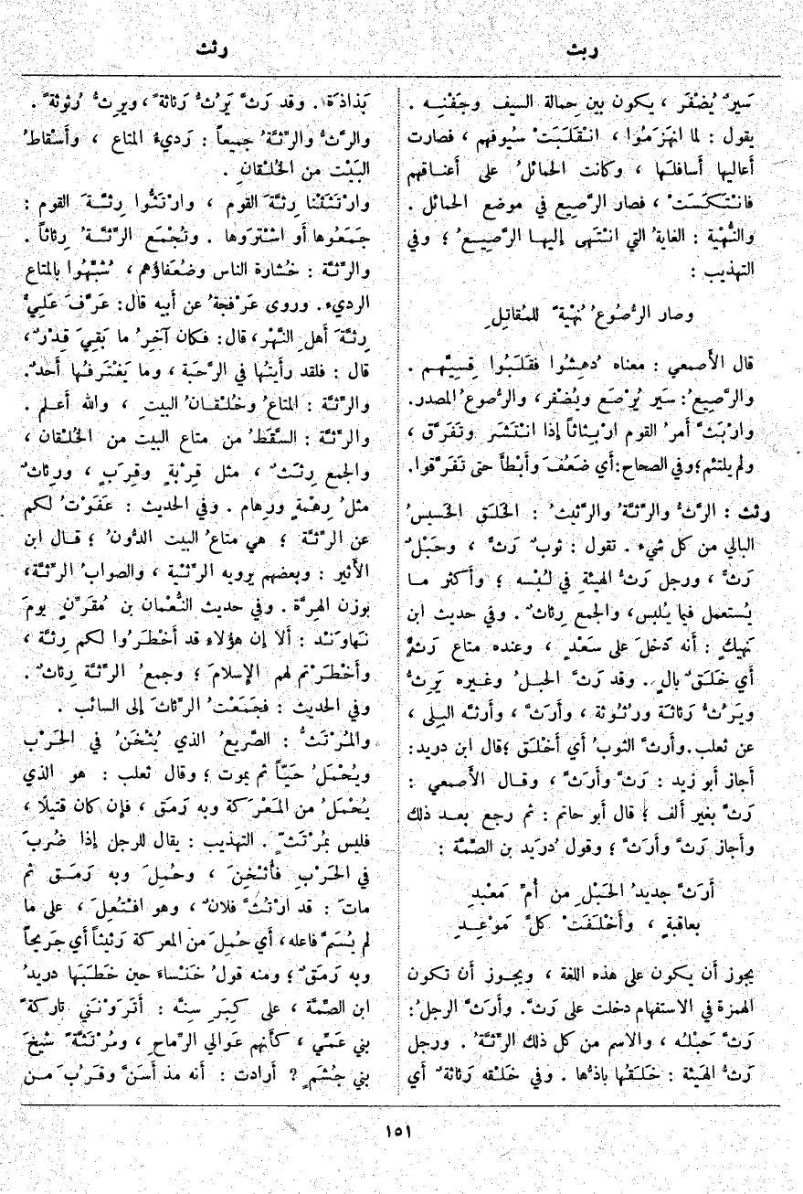 رثث: الرَّثُّ والرِّثَّةُ والرَّثيثُ: الخَلَق الخَسيسُ الْبَالِي مِنْ كُلِّ شَيْءٍ. تَقُولُ: ثوبٌ رَثٌّ، وحَبْلٌ رَثٌّ، وَرَجُلٌ رَثُّ الهيئةِ فِي لُبْسه؛ وأَكثر مَا يُستعمل فِيمَا يُلبس، وَالْجَمْعُ رِثاثٌ. وَفِي حَدِيثِ