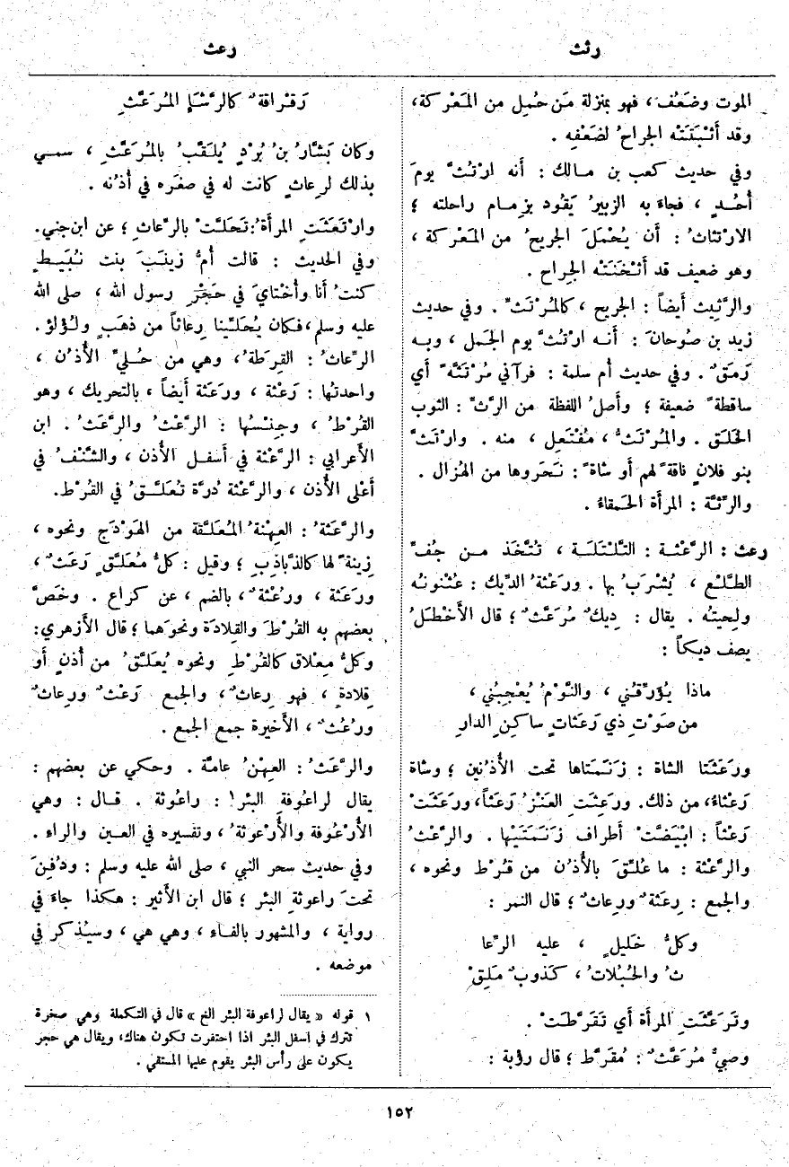 الرِّعاثُ: القِرَطةُ، وَهِيَ مِنْ حُليِّ الأُذُن، واحدتُها: رَعْثة، ورَعَثة أَيضاً، بِالتَّحْرِيكِ، وَهُوَ القُرْطُ، وجِنْسُها: الرَّعْثُ والرَّعَثُ. ابْنُ الأَعرابي: الرَّعْثة فِي أَسفل الأُذن، والشَّنْفُ فِي أَعْلى الأُذن، والرَّعْثة دُرَّة تُعَلَّقُ فِي القُرْط. والرَّعَثةُ: العِهْنةُ المُعَلَّقة مِنَ الهَوْدَج وَنَحْوِهِ، زِينةً لَهَا كالذَّباذِبِ؛ وَقِيلَ: كلُّ مُعَلَّقٍ رَعَثٌ، ورَعَثة، ورُعْثةٌ، بِالضَّمِّ، عَنْ كُرَاعٍ. وخَصَّ بَعْضُهُمْ بِهِ القُرْطَ والقِلادَة ونحوَهما؛ قَالَ الأَزهري: وكلُّ مِعْلاق كالقُرْطِ وَنَحْوِهِ يُعَلَّقُ مِنْ أُذنٍ أَو قِلادةٍ، فَهُوَ رِعاثٌ، وَالْجَمْعُ رعْثٌ ورِعاثٌ ورُعُثٌ، الأَخيرة جَمْعُ الْجَمْعِ. والرَّعَثُ: العِهْنُ عامَّة. وَحُكِيَ عَنْ بَعْضِهِمْ: يُقَالُ لراعُوفةِ الْبِئْرِ «5»: راعُوثة. قَالَ: وَهِيَ الأُرْعُوفة والأُرْعوثةُ، وَتَفْسِيرُهُ فِي الْعَيْنِ والراءِ. وَفِي حَدِيثِ سِحْرِ النَّبِيِّ، صَلَّى اللَّهُ عَلَيْهِ وَسَلَّمَ: