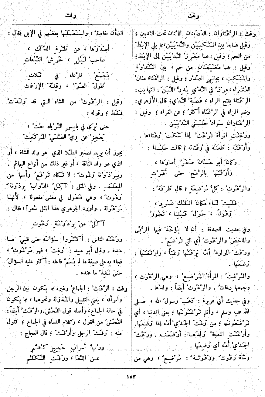 رفث: الرَّفَثُ: الجماعُ وَغَيْرُهُ مِمَّا يَكُونُ بَيْنَ الرَّجُلِ وامرأَته، يَعْنِي التَّقْبِيلَ والمُغازلة وَنَحْوَهُمَا، مِمَّا يَكُونُ فِي حَالَةِ الْجِمَاعِ، وأَصله قَوْلُ الفُحْش. والرَّفَثُ أَيضاً: الفُحْشُ مِنَ الْقَوْلِ، وَكَلَامُ النساءِ فِي الْجِمَاعِ؛ تَقُولُ مِنْهُ: رَفَثَ الرَّجُلُ وأَرْفَثَ؛ قَالَ الْعَجَّاجُ:
