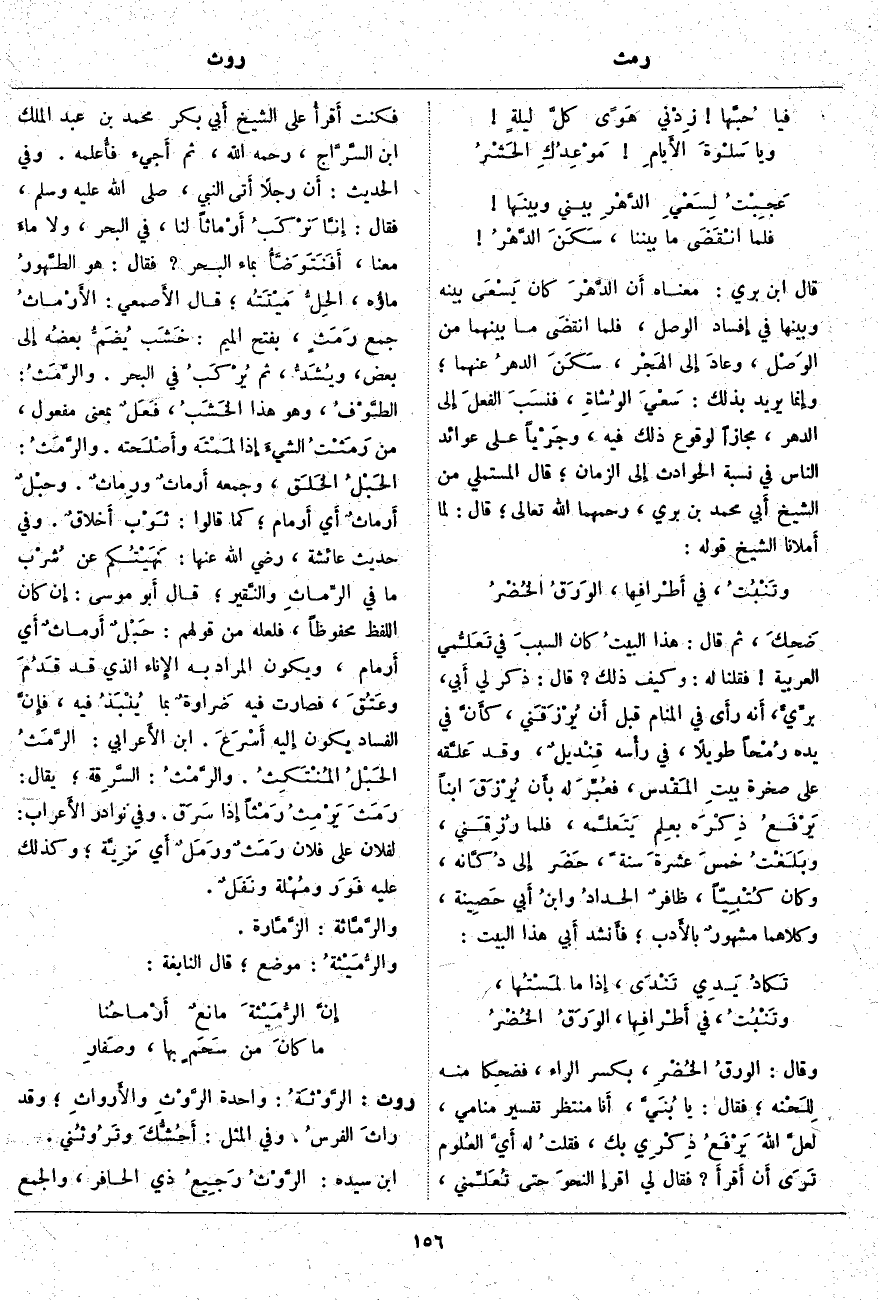 روث: الرَّوْثَةُ: وَاحِدَةُ الرَّوْثِ والأَرواثِ؛ وَقَدْ راثَ الفرسُ. وَفِي الْمَثَلِ: أَحُشُّكَ وتَرُوثُني. ابْنُ سِيدَهْ: الرَّوْثُ رَجِيعُ ذِي الْحَافِرِ، وَالْجَمْعُ