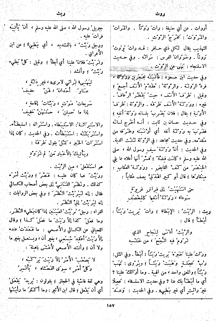 ورَاثَ عَلَيْنَا خَبَرُهُ يَريثُ رَيْثاً: أَبْطأَ. وَفِي الْمَثَلِ: رُبَّ عَجَلةٍ وَهَبَتْ رَيْثاً؛ ويُرْوى: تَهَبُ رَيْثاً؛ وَالْمَعْنَى وَاحِدٌ، مِنَ الهِبة. وَمَا أَراثكَ عَلَيْنَا؟ أَي مَا أَبْطَأَ بِكَ عَنَّا؟ وَفِي حَدِيثِ الِاسْتِسْقَاءِ: