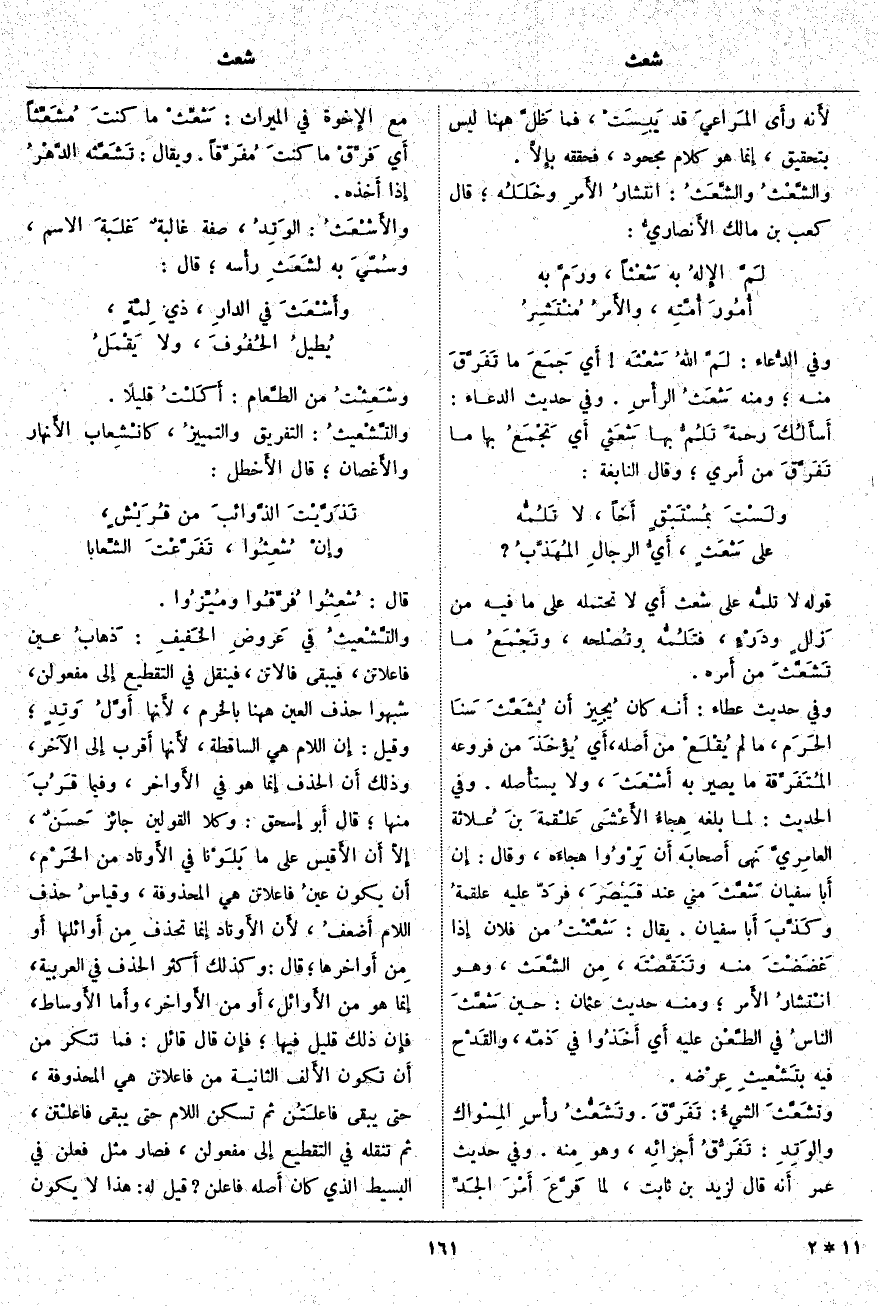 قَالَ: شُعِثُوا فُرِّقُوا ومُيِّزُوا. والتَّشْعيثُ فِي عَروضِ الخَفيفِ: ذَهابُ عَيْنِ فَاعِلَاتُنْ، فَيَبْقَى فَالَاتُنْ، فَيُنْقَلُ فِي التَّقْطِيعِ إِلى مَفْعُولُنْ، شبهوا حذف العين هاهنا بِالْخَرْمِ، لأَنها أَوَّلُ وَتِدٍ؛ وَقِيلَ: إِن اللَّامَ هِيَ السَّاقِطَةُ، لأَنها أَقرب إِلى الْآخَرِ، وَذَلِكَ أَن الْحَذْفَ إِنما هُوَ فِي الأَواخر، وَفِيمَا قَرُبَ مِنْهَا؛ قَالَ أَبو إِسحاق: وَكِلَا الْقَوْلَيْنِ جَائِزٌ حَسَنٌ، إِلّا أَن الأَقيس عَلَى مَا بَلَوْنا فِي الأَوتاد مِنَ الخَرْم، أَن يَكُونَ عينُ فَاعِلَاتُنْ هِيَ الْمَحْذُوفَةُ، وقياسُ حَذْفِ اللَّامِ أَضعفُ، لأَن الأَوتاد إِنما تُحْذَفُ مِن أَوائلها أَو مِن أَواخرها؛ قَالَ: وَكَذَلِكَ أَكثر الْحَذْفِ فِي الْعَرَبِيَّةِ، إِنما هُوَ مِنَ الأَوائل، أَو مِنَ الأَواخر، وأَما الأَوساط، فإِن ذَلِكَ قَلِيلٌ فِيهَا؛ فإِن قَالَ قَائِلٌ: فَمَا تُنْكِرُ مِنْ أَن تَكُونَ الأَلف الثَّانِيَةُ مِنْ فَاعِلَاتُنْ هِيَ الْمَحْذُوفَةَ، حتى يبقى فاعلَتُن ثم تُسَكِّنَ اللَّامُ حَتَّى يَبْقَى فاعلْتن، ثُمَّ تَنْقُلَهُ فِي التَّقْطِيعِ إِلى مَفْعُولُنْ، فَصَارَ مِثْلَ فَعِلُنْ فِي الْبَسِيطِ الَّذِي كَانَ أَصله فَاعِلُنْ؟ قِيلَ لَهُ: هَذَا لَا يَكُونُ