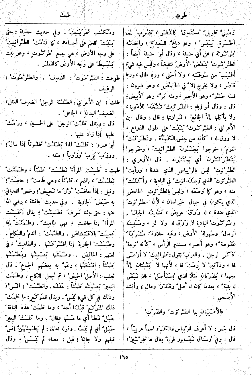 رَمْلِيٌّ طَويلٌ مُسْتَدِقٌّ كالفُطْر، يَضْرِبُ إِلى الحُمْرةِ يَيْبَسُ، وَهُوَ دباغٌ للمَعِدَةِ، واحدتُه طُرْثُوثة؛ عَنْ أَبي حَنِيفَةَ، وَقَالَ أَبو حَنِيفَةَ أَيضاً: الطُّرْثُوثُ يُنَقِّضُ الأَرضَ تَنْقِيضًا، وَلَيْسَ فِيهِ شيءٌ أَطْيَبَ مِنْ سُوقَتِه، وَلَا أَحْلى، وَرُبَّمَا طَالَ، وَرُبَّمَا قَصُر، وَلَا يَخْرُجُ إِلَّا فِي الحَمْضِ، وَهُوَ ضَرْبَانِ: فَمِنْهُ حُلْوٌ، وَهُوَ الأَحمر، وَمِنْهُ مُرٌّ، وَهُوَ الأَبيض؛ قَالَ: وَقَالَ أَبو زِيَادٍ: الطَّراثِيثُ تُتَّخَذُ للأَدْوية، وَلَا يأْكلها إِلّا الجائعُ، لمَرارتها؛ قَالَ: وَقَالَ ابْنُ الأَعرابي: الطُّرْثُوثُ يَنْبُتُ عَلَى طُولِ الذِّرَاعِ، لَا وَرَقَ لَهُ، كأَنه مِنْ جِنْسِ الكَمْأَة. وتَطَرْثَثَ القومُ: خَرَجُوا يَجْتَنُونَ الطَّراثِيثَ، وخَرجوا يَتَطَرْثَثُون أَي يَجْتَنُونه. قَالَ الأَزهري: الطُّرْثوثُ لَيْسَ بالرِّيباسِ الَّذِي عِنْدَنَا، ورأَيتُ الطُّرْثوثَ الَّذِي وَصَفَه الليثُ فِي الْبَادِيَةِ، وأَكَلْتُ مِنْهُ، وَهُوَ كَمَا وَصَفَه، وَلَيْسَ بالطُّرْثوثِ الحامضِ الَّذِي يَكُونُ فِي جِبَالِ خُراسان، لأَن الطُّرْثوثَ الَّذِي عِنْدَنَا، لَهُ وَرَقٌ عَرِيضٌ، مَنْبِتُه الجبالُ. وطُرْثُوثُ الْبَادِيَةِ لَا وَرَق لَهُ وَلَا ثَمَرَ، ومَنْبِتُه الرمالُ وسُهولةُ الأَرض، وَفِيهِ حلاوةٌ مُشْرَبَةٌ عُفُوصةً، وَهُوَ أَحمر، مُسْتَدِيرُ الرأْس، كأَنه ثُومةُ ذَكَرِ الرَّجُلِ. والعربُ تَقُولُ: طَراثِيثُ لَا أَرْطَى لَهَا، وذآنينُ لَا رِمْثَ لَهَا، لأَنهما لَا يَنْبُتانِ إِلَّا مَعَهُمَا، يُضْرَبانِ مَثَلًا لِلَّذِي يُسْتَأْصَلُ، فَلَا تَبْقَى لَهُ بقيةٌ، بَعْدَ مَا كَانَ لَهُ أَصلٌ وقَدْرٌ وَمَالٌ؛ وأَنشد الأَصمعي: