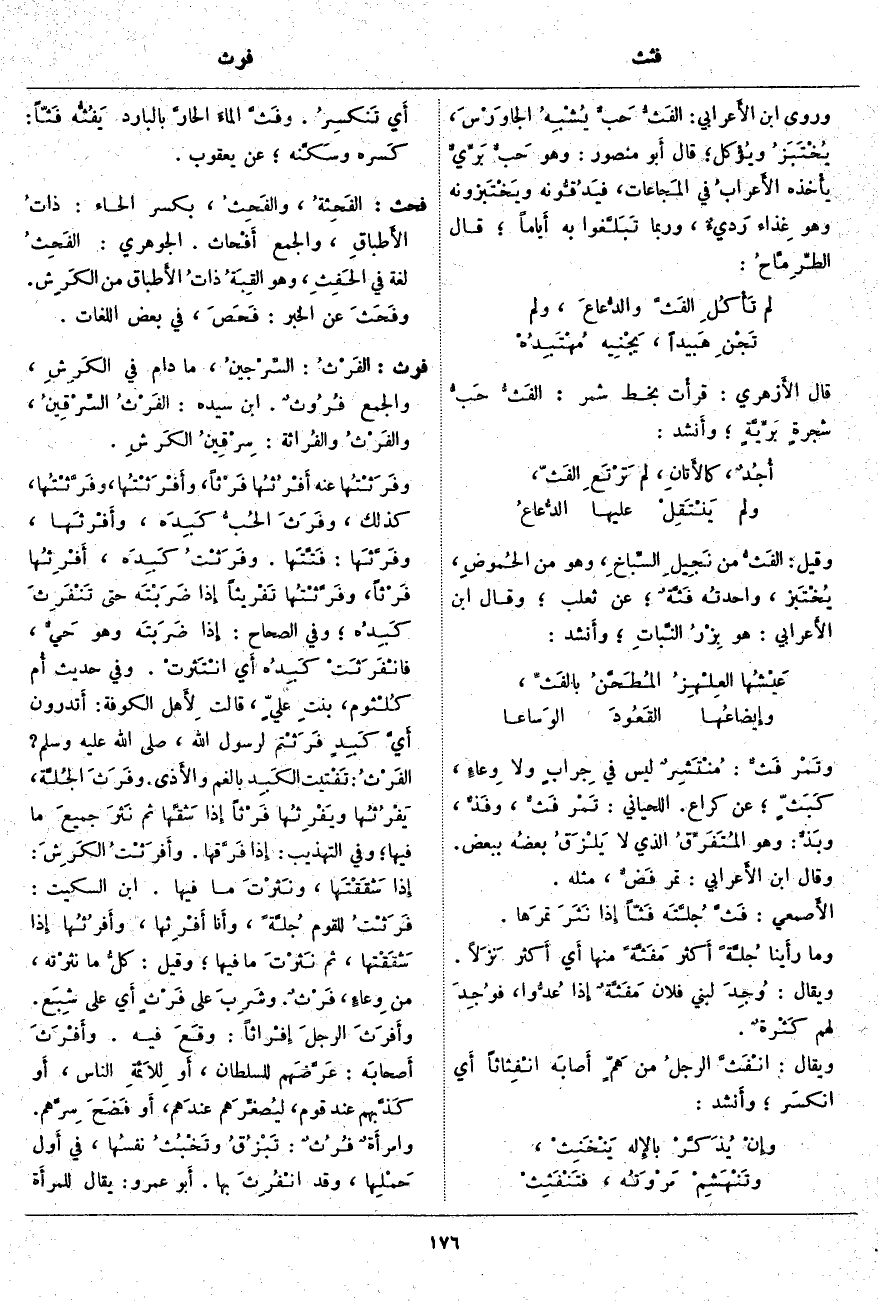 فرث: الفَرْثُ: السِّرْجينُ، مَا دَامَ فِي الكَرِشِ، وَالْجَمْعُ فُرُوثٌ. ابْنُ سِيدَهْ: الفَرْثُ السِّرْقِينُ، والفَرْثُ والفُراثة: سِرْقِينُ الكَرشِ. وفَرَثْتُها عَنْهُ أَفْرُثُها فَرْثاً، وأَفْرَثْتُها، وفَرَّثْتُها، كَذَلِكَ، وفَرَثَ الحُبُّ كَبِدَه، وأَفْرثَها، وفَرَّثَها: فَتَّتَها. وفَرَثْتُ كَبِدَه، أَفْرِثُها فَرْثاً، وفَرَّثْتُها تَفْريثاً إِذا ضَرَبْتَه حَتَّى تَنْفَرِثَ كَبِدُه؛ وَفِي الصِّحَاحِ: إِذا ضَرَبتَه وَهُوَ حَيٌّ، فانْفَرَثَتْ كَبِدُه أَي انْتَثرتْ. وَفِي حَدِيثِ