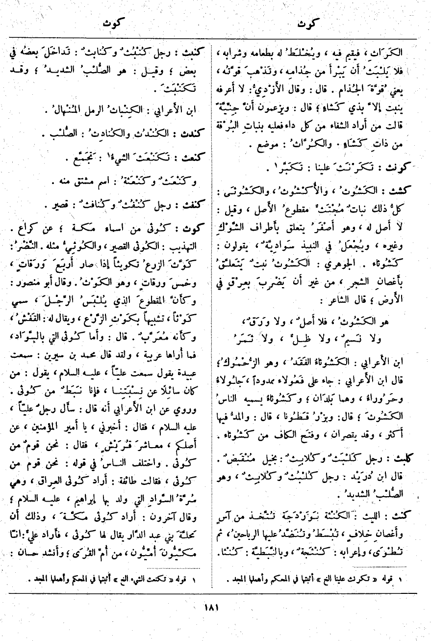 كوث: كُوثى مِنْ أَسْمَاءِ مَكة؛ عَنْ كُرَاعٍ. التَّهْذِيبُ: الكُوثى الْقَصِيرُ، والكُوثِيُّ مِثْلُهُ. النَّضْرُ: كَوَّثَ الزرعُ تَكْوِيثًا إِذا صَارَ أَربَعَ وَرَقاتٍ، وخمسَ ورقاتٍ، وَهُوَ الكَوْثُ. وَقَالَ أَبو مَنْصُورٍ: وكأَنَّ المقطوعَ الَّذِي يُلْبَسُ الرِّجْلَ، سُمِّيَ كَوْثاً، تَشْبِيهًا بكَوْثِ الزَّرْع، وَيُقَالُ لَهُ: القَفْشُ، وكأَنه مُعَرَّبٌ. قَالَ: وأَما كُوثى الَّتِي بالسَّوَاد، فَمَا أُراها عَرَبِيَّةً، وَلَقَدْ