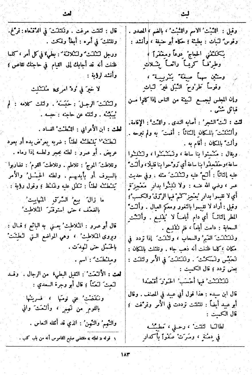 لثث: لُثَّ الشجرُ: أَصابه النَّدَى. واللَّثُّ: الإِقامة. وأَلْثَثْتَ بالمكانِ إِلْثاثاً: أَقمتَ بِهِ وَلَمْ تَبْرَحْهُ وأَلثَّ بِالْمَكَانِ: أَقام بِهِ. وَيُقَالُ: مَثْمِثوا بِنَا سَاعَةً، وتَمَثْمَثُوا، ولَثْلِثُوا سَاعَةً، وحَفْحِفُوا بِنَا سَاعَةً أَي رَوِّحوا بِنَا قَلِيلًا، وأَلَثَّ عَلَيْهِ إِلثاثاً: أَلَحَّ عَلَيْهِ ولَثْلَثَ مِثْلَهُ. وَفِي حَدِيثِ