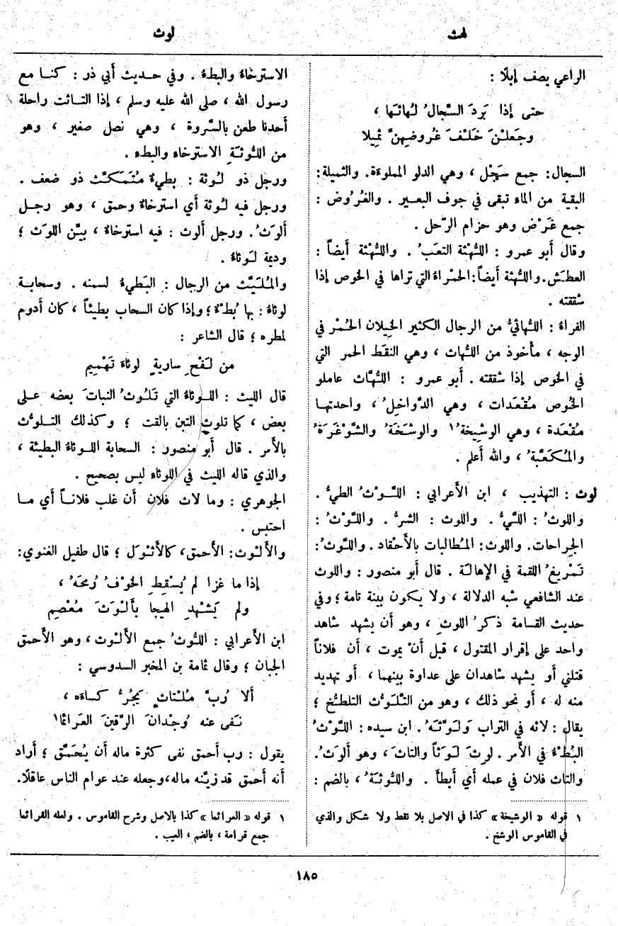 السِّجَالُ: جَمْعُ سَجْل، وَهِيَ الدَّلْوُ المملوءَة. وَالثَّمِيلَةُ: الْبَقِيَّةُ مِنَ الماءِ تَبْقَى فِي جَوْفِ الْبَعِيرِ. والغُرُوض: جَمْعُ غَرْض وَهُوَ حِزَامُ الرَّحْلِ. وَقَالَ أَبو عَمْرٍو: اللُّهْثة التَعبُ. واللُّهْثة أَيضاً: العطَش. واللُّهثة أَيضاً: الحمْراءُ الَّتِي تَرَاهَا فِي الْخُوصِ إِذا شَقَقْتَهُ. الفراءُ: اللُّهاثيُّ مِنَ الرِّجَالِ الْكَثِيرُ الخِيلان الحُمْر فِي الْوَجْهِ، مأْخوذ مِنَ اللُّهاث، وَهِيَ النقَط الْحُمْرُ الَّتِي فِي الْخُوصِ إِذا شَقَقْتَهُ. أَبو عَمْرٍو: اللُّهَّاث عَامِلُو الخُوص مُقْعَدات، وَهِيَ الدَّواخِلُ، وَاحِدَتُهَا مُقْعَدة، وَهِيَ الوشِيخةُ «1» والوشَخَةُ والشَّوْغَرةُ والمُكَعَّبةُ، والله أَعلم.