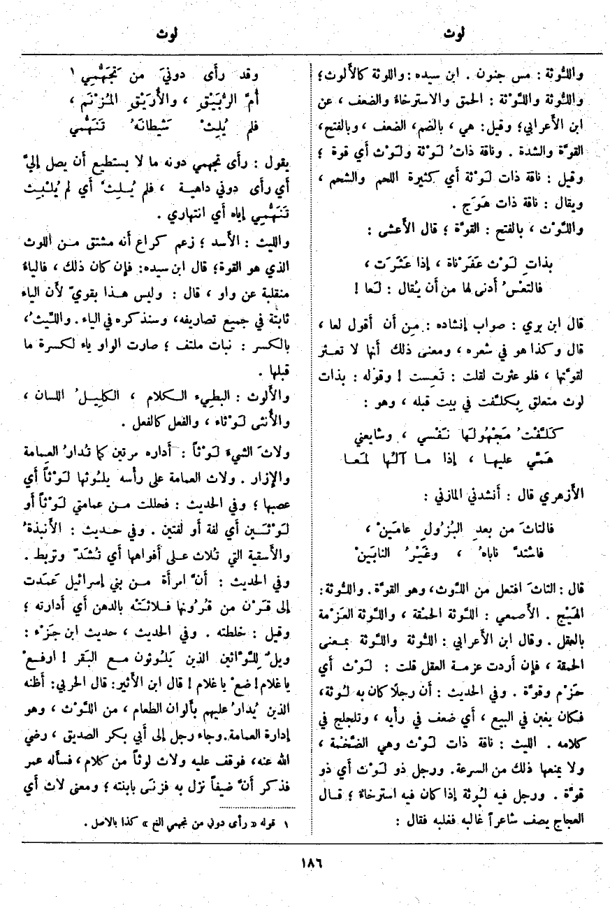 يَقُولُ: رأَى تَجَهُّمِي دُونَهُ مَا لَا يَسْتَطِيعُ أَن يَصِلَ إِليَّ أَي رأَى دُونِيَ دَاهِيَةً، فَلَمْ يُلِثْ أَي لَمْ يُلْبِث تَنَهُّمِي إِياه أَي انْتِهَارِي. وَاللَّيْثُ: الأَسد؛ زَعَمَ كُرَاعٌ أَنه مُشْتَقٌّ مِنَ اللَّوْثِ الَّذِي هُوَ الْقُوَّةُ؛ قَالَ ابْنُ سِيدَهْ: فإِن كَانَ ذَلِكَ، فالياءُ مُنْقَلِبَةٌ عَنْ وَاوٍ، قَالَ: وَلَيْسَ هَذَا بِقَوِيٍّ لأَن الْيَاءَ ثَابِتَةٌ فِي جَمِيعِ تَصَارِيفِهِ، وَسَنَذْكُرُهُ فِي الْيَاءِ. واللِّيثُ، بِالْكَسْرِ: نَبَاتٌ مُلْتَفٌّ؛ صَارَتِ الْوَاوُ يَاءً لِكَسْرَةِ مَا قَبْلَهَا. والأَلوث: البطِيء الْكَلَامِ، الكلِيلُ اللِّسَانِ، والأُنثى لَوْثاء، وَالْفِعْلُ كَالْفِعْلِ. ولاثَ الشيءَ لَوْثاً: أَداره مَرَّتَيْنِ كَمَا تُدارُ العِمامة والإِزار. وَلَاثَ الْعِمَامَةَ عَلَى رأْسه يلُوثها لَوْثاً أَي عَصَبَهَا؛ وَفِي الْحَدِيثِ: