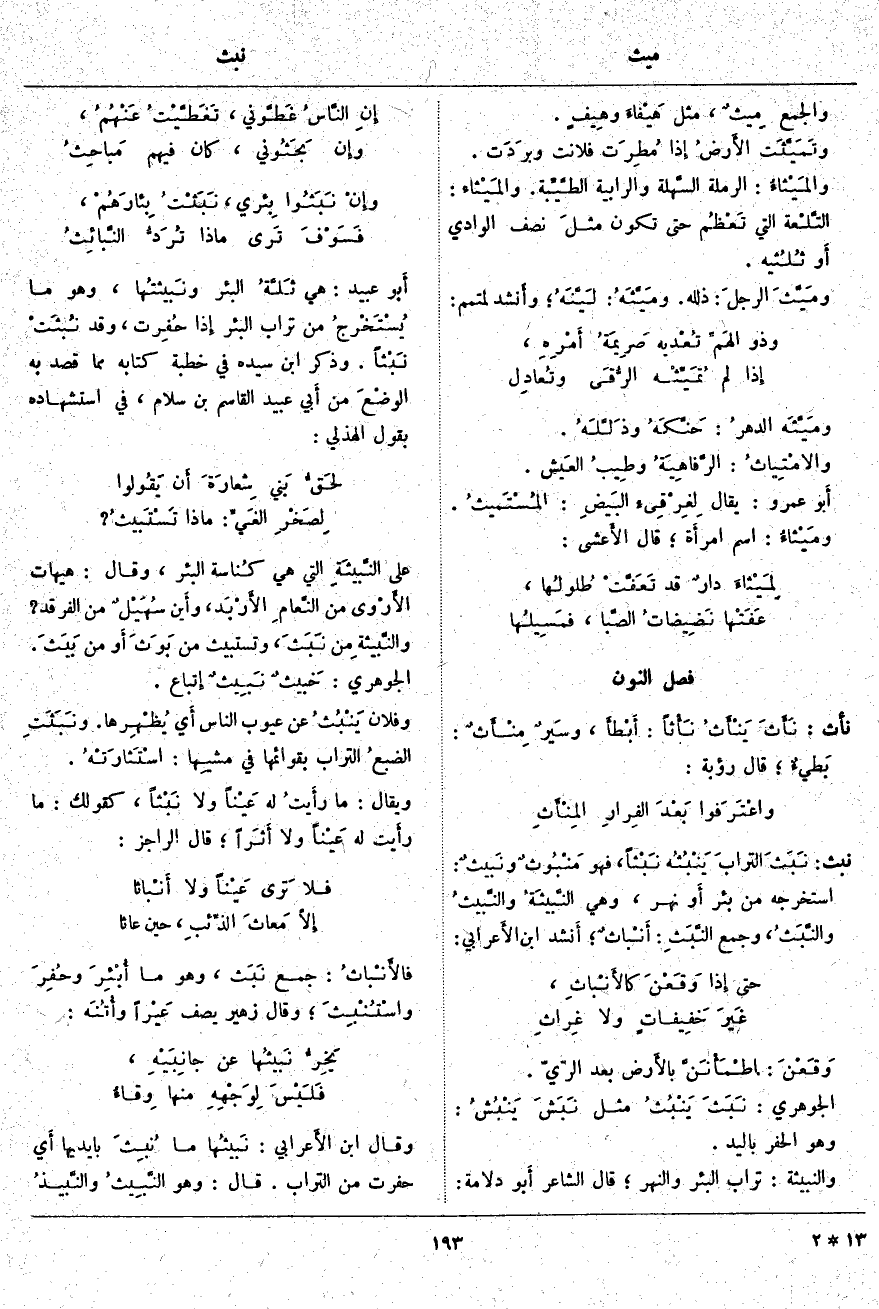 نبث: نَبَثَ الترابَ يَنْبُثُه نَبْثاً، فَهُوَ مَنْبُوثٌ ونَبيثٌ: اسْتَخْرَجَهُ مِنْ بِئْرٍ أَو نَهَرٍ، وَهِيَ النَّبيثَةُ والنَّبيثُ والنَّبَثُ، وَجَمْعُ النَّبَثِ: أَنْباثٌ؛ أَنشد ابْنِ الأَعرابي: