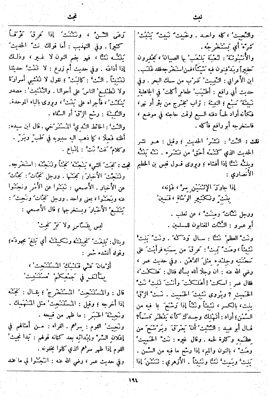 نثث: النَّثُّ: نَشْرُ الحديثِ؛ وَقِيلَ: هُوَ نَشْرُ الْحَدِيثِ الَّذِي كَتْمُه أَحَقُّ مِنْ نَشْرِه. نَثَّه يَنُثُّه وينِثُّه نَثًّا إِذا أَفشاه؛ وَيُرْوَى قَوْلُ قَيْسِ بْنِ الْخَطِيمِ الأَنصاري: