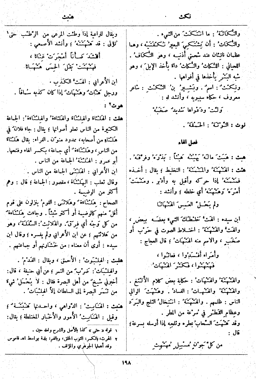 هنبث: الهَنَابِثُ: الدَّواهي، وَاحِدَتُهَا هَنْبَثَةٌ؛ وَقِيلَ: الهَنَابِثُ الأُمور والأَخْبار المختلطة؛ يقال: