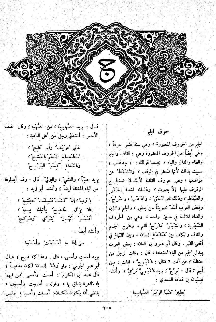 ج: الْجِيمُ مِنَ الْحُرُوفِ الْمَجْهُورَةِ، وَهِيَ سِتَّةَ عَشَرَ حَرْفًا، وَهِيَ أَيضاً مِنَ الْحُرُوفِ الْمَحْقُورَةِ وَهِيَ: الْقَافُ وَالْجِيمُ وَالطَّاءُ وَالدَّالُ وَالْبَاءُ، يَجْمَعُهَا قولك: [جدقطب] سُمِّيتَ بِذَلِكَ لأَنها تُحقر فِي الْوَقْفِ، وتُضْغَطُ عَنْ مَوَاضِعِهَا، وَهِيَ حُرُوفُ الْقَلْقَلَةِ لأَنك لَا تَسْتَطِيعُ الْوُقُوفَ عَلَيْهَا إِلَّا بِصَوْتٍ، وَذَلِكَ لِشِدَّةِ الحَقْرِ والضَّغْطِ، وَذَلِكَ نَحْوَ الْحَقْ، واذْهَبْ، واخْرُجْ. وَبَعْضُ الْعَرَبِ أَشدّ تَصْوِيتًا مِنْ بَعْضٍ، وَالْجِيمُ وَالشِّينُ وَالضَّادُ ثَلَاثَةٌ فِي حَيِّزٍ وَاحِدٍ، وَهِيَ مِنَ الْحُرُوفِ الشَّجْرية، والشَّجْرُ مَفْرَجُ الْفَمِ، وَمَخْرَجُ الْجِيمِ وَالْقَافِ وَالْكَافِ بَيْنَ عَكَدَةِ اللِّسَانِ، وَبَيْنَ اللَّهاةِ فِي أَقصى الفَم. وَقَالَ أَبو عَمْرِو بْنُ الْعَلَاءِ: بَعْضُ الْعَرَبِ يُبْدِلُ الْجِيمَ مِنَ الْيَاءِ الْمُشَدَّدَةِ، قَالَ: وَقُلْتُ لِرَجُلٍ مِنْ حَنْظَلَةَ: مِمَّنْ أَنت؟ فَقَالَ: فُقَيْمِجٌّ، فَقُلْتُ: مِن أَيهم؟ قَالَ: مُرِّجٌّ؛: يُرِيدُ فُقَيْمِيٌّ مُرِّيٌّ؛ وأَنشد لِهمْيان بْنِ قُحَافَةَ السَّعْدِيِّ: