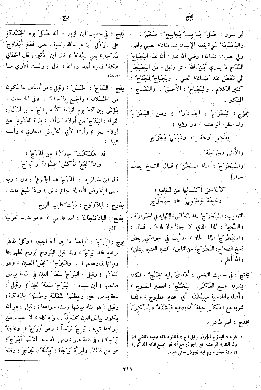 (1). قوله [البحزج الجوذر وقيل إلخ] انظره فإن صنيعه يقتضي أَن ولد البقرة الوحشية غير الجوذر مع أَنه هو بجميع لغاته المذكورة في مادة جذر، ولم نجد للجوذر معنى غيره.