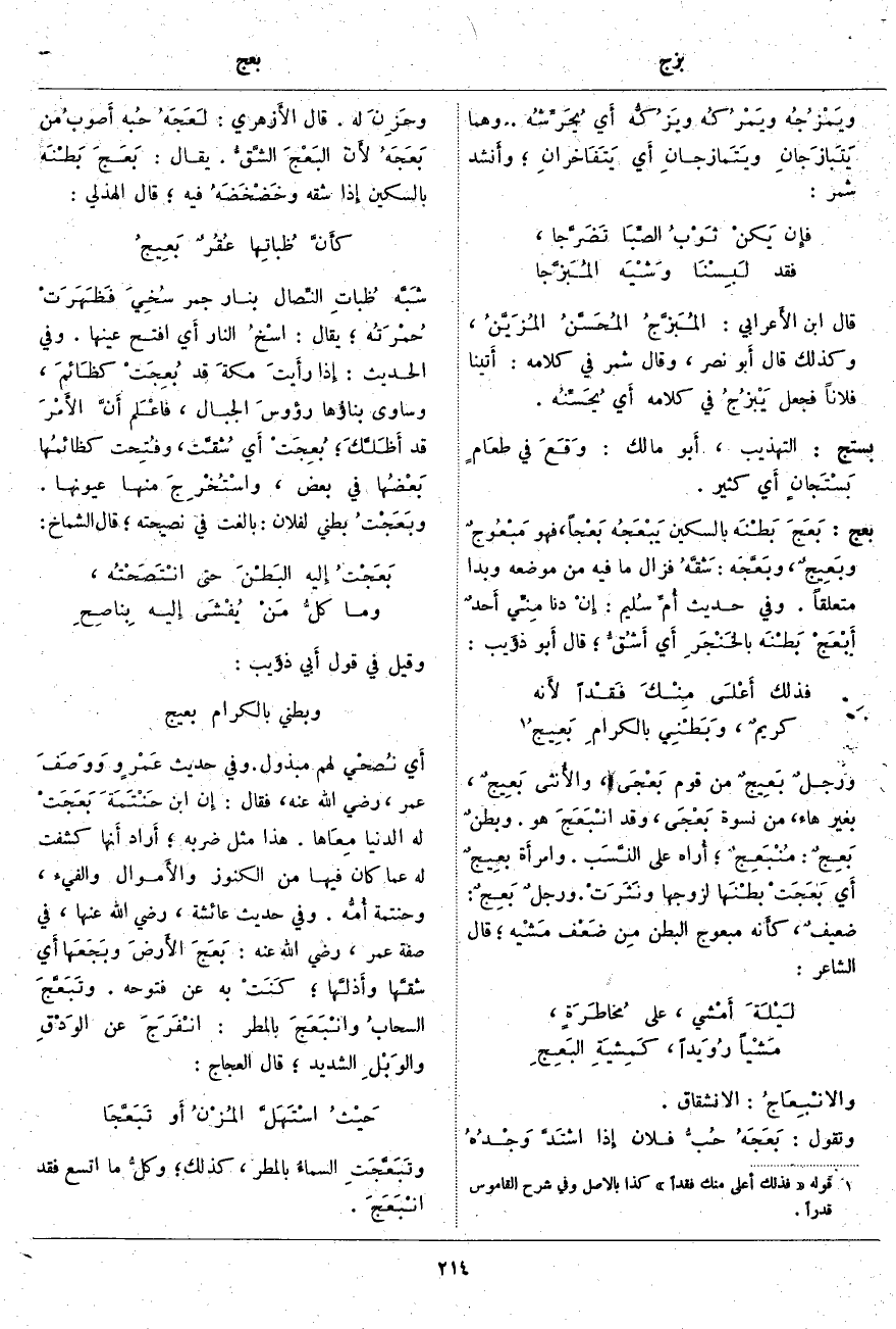 بعج: بَعَجَ بَطْنَه بِالسِّكِّينِ يَبْعَجُه بَعْجاً، فَهُوَ مَبْعُوجٌ وبَعِيجٌ، وبَعَّجه: شَقَّهُ فَزَالَ مَا فِيهِ مِنْ مَوْضِعِهِ وَبَدَا مُتَعَلِّقًا. وَفِي حَدِيثِ