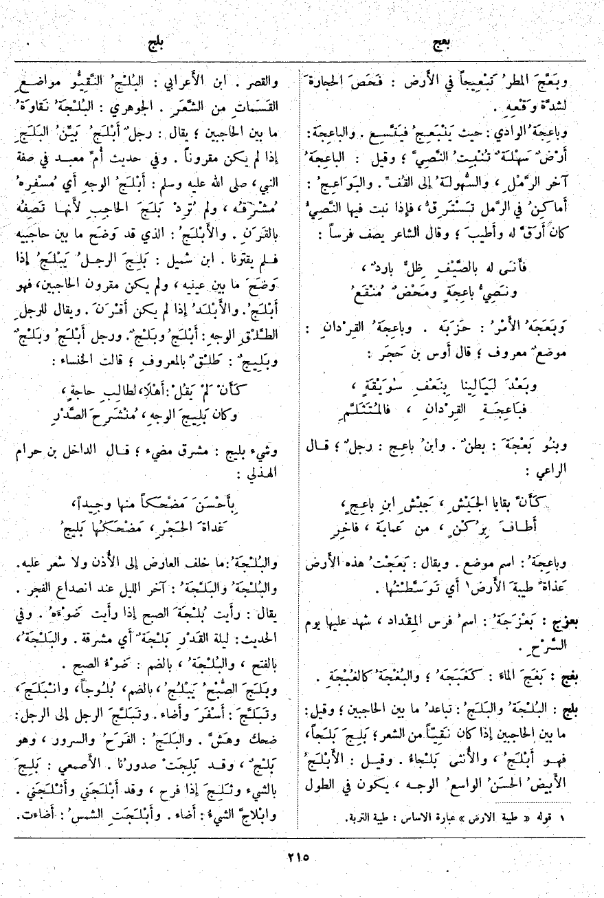 بلج: البُلْجَةُ والبَلَجُ: تباعدُ مَا بَيْنَ الْحَاجِبَيْنِ؛ وَقِيلَ: مَا بَيْنَ الْحَاجِبَيْنِ إِذا كَانَ نَقِيّاً مِنَ الشَّعْرِ؛ بَلِجَ بَلَجاً، فَهُوَ أَبْلَجُ، والأُنثى بَلْجاءُ. وَقِيلَ: الأَبْلَجُ الأَبيضُ الحسَنُ الواسعُ الْوَجْهُ، يَكُونُ فِي الطُّولِ وَالْقِصَرِ. ابْنُ الأَعرابي: البُلْجُ النَّقِيُّو مواضعِ القَسَماتِ مِنَ الشَّعَرِ. الْجَوْهَرِيُّ: البُلْجَةُ نَقاوَةُ مَا بَيْنَ الْحَاجِبَيْنِ؛ يُقَالُ: رجلٌ أَبْلَجُ بَيِّنُ البَلَجِ إِذا لَمْ يَكُنْ مَقْرُونًا. وَفِي حَدِيثِ