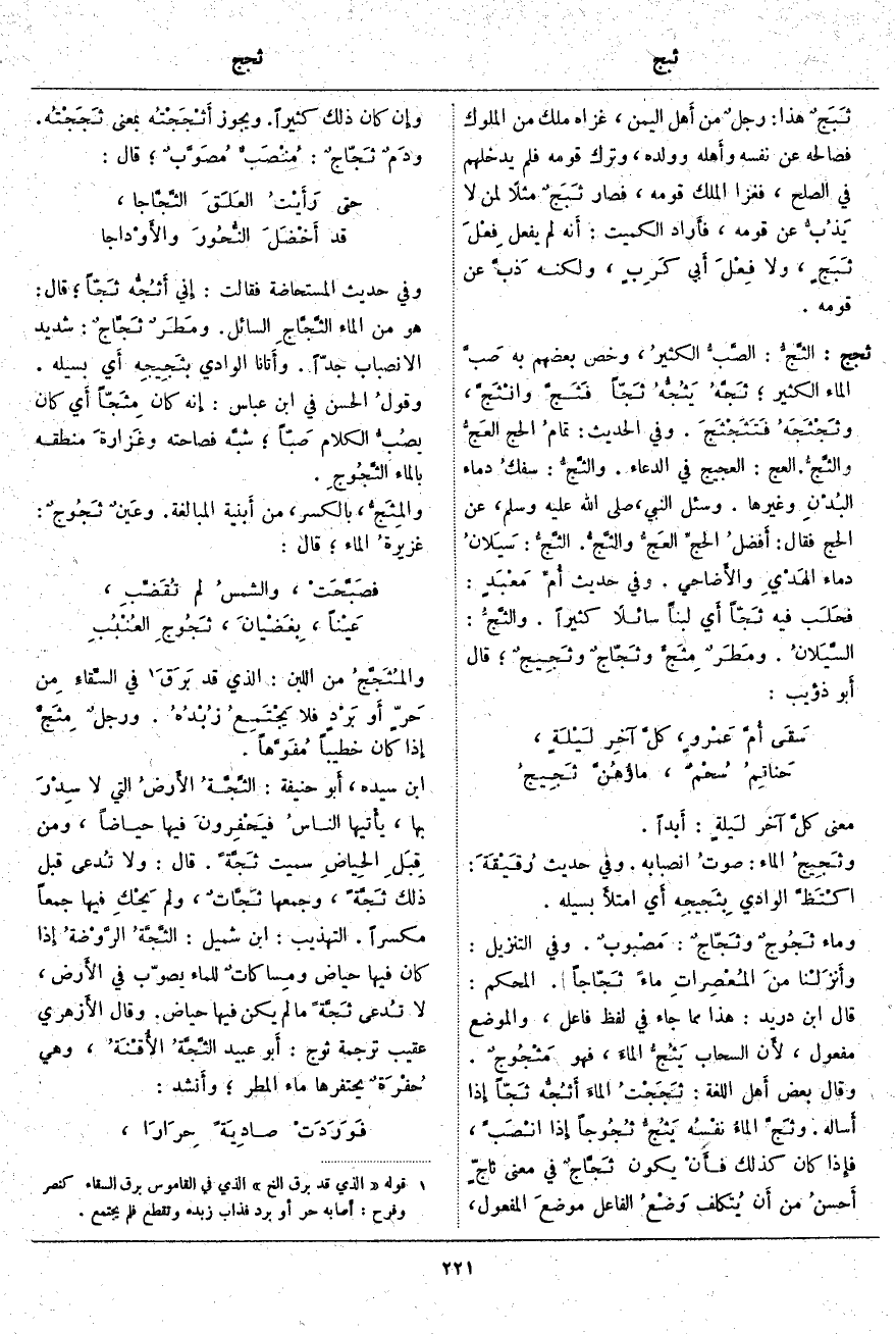 ثجج: الثَّجُّ: الصَّبُّ الكثيرُ، وَخَصَّ بَعْضُهُمْ بِهِ صَبَّ الْمَاءِ الْكَثِيرِ؛ ثَجَّهُ يَثُجُّهُ ثَجّاً فَثَجَّ وانْثَجَّ، وثَجْثَجَهُ فَتَثَجْثَجَ. وَفِي الْحَدِيثِ: