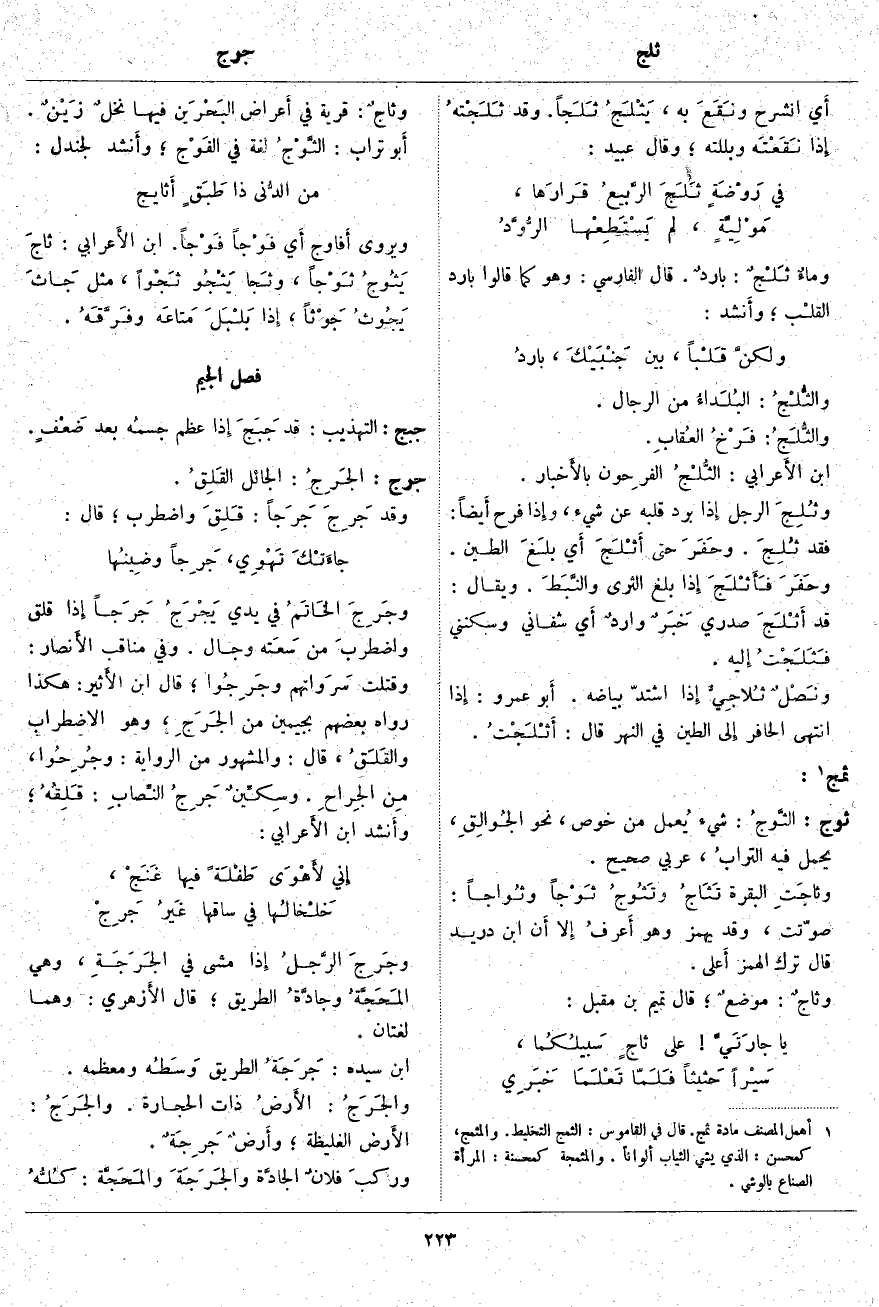 ثوج: الثَّوجُ: شَيْءٌ يُعمل مِنْ خُوصٍ، نَحْوَ الجُوالِقِ، يُحْمَلُ فِيهِ الترابُ، عَرَبِيٌّ صَحِيحٌ. وثاجَتِ الْبَقَرَةُ تَثَاجُ وتَثُوجُ ثَوْجاً وثُواجاً: صَوَّتَتْ، وَقَدْ يُهْمَزُ وَهُوَ أَعرفُ إِلا أَن ابْنَ دُرَيْدٍ قَالَ تَرْكُ الْهَمْزِ أَعلى. وثاجٌ: موضعٌ، قَالَ تَمِيمُ بْنُ مُقْبِلٍ: