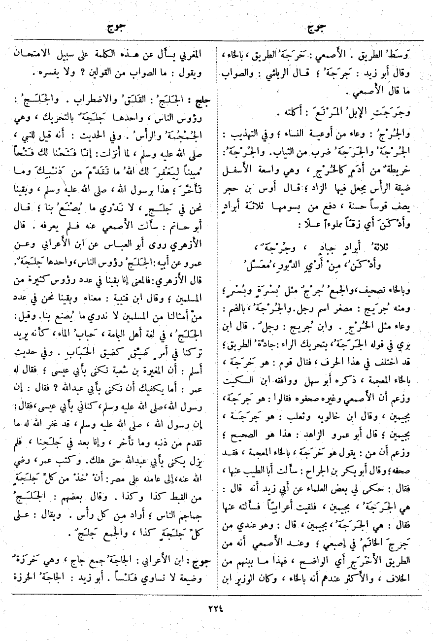 وَبِالْخَاءِ تَصْحِيفٌ، والجمعُ جُرْجٌ مِثْلُ بُسْرَةٍ وبُسْرٍ؛ وَمِنْهُ جُرَيج: مُصَغَّرٌ اسْمُ رَجُلٍ. والجُرْجَةُ، بِالضَّمِّ: وِعَاءٌ مِثْلُ الخُرْجِ. وَابْنُ جُريج: رجلٌ. قَالَ ابْنُ بَرِّيٍّ فِي قَوْلِهِ الجَرَجَةُ، بِتَحْرِيكِ الرَّاءِ: جادَّةُ الطَّرِيقِ؛ قَدِ اخْتُلِفَ فِي هَذَا الْحَرْفِ، فَقَالَ قَوْمٌ: هُوَ خَرَجَة، بِالْخَاءِ الْمُعْجَمَةِ ذَكَرَهُ أَبو سَهْلٍ وَوَافَقَهُ ابْنُ السِّكِّيتِ وَزَعَمَ أَن الأَصمعي وَغَيْرَهُ صَحَّفُوهُ فَقَالُوا: هُوَ جَرَجَة، بِجِيمَيْنِ، وَقَالَ ابْنُ خَالَوَيْهِ وَثَعْلَبٌ: هُوَ جَرَجَة، بِجِيمَيْنِ؛ قَالَ أَبو عَمْرٍو الزَّاهِدُ: هَذَا هُوَ الصَّحِيحُ؛ وَزَعَمَ أَن مَنْ: يَقُولُ هُوَ خَرَجَة، بِالْخَاءِ الْمُعْجَمَةِ، فَقَدْ صَحَّفَهُ؛ وَقَالَ أَبو بَكْرِ بْنُ الْجَرَّاحِ: سأَلت أَبا الطَّيِّبِ عَنْهَا، فَقَالَ: حَكَى لِي بَعْضُ الْعُلَمَاءِ عَنْ أَبي زَيْدٍ أَنه قَالَ: هِيَ الجَرَجَةُ، بِجِيمَيْنِ، فَلَقِيتُ أَعرابيّاً فسأَلته عَنْهَا فَقَالَ: هِيَ الجَرَجَةُ، بِجِيمَيْنِ، قَالَ: وَهُوَ عِنْدِي مِنْ جَرِجَ الخاتَمُ فِي إِصبعي؛ وَعِنْدَ الأَصمعي أَنه مِنَ الطَّرِيقِ الأَخْرَجِ أَي الْوَاضِحِ، فَهَذَا مَا بَيْنَهُمْ مِنَ الْخِلَافِ، والأَكثر عِنْدَهُمْ أَنه بِالْخَاءِ، وَكَانَ الْوَزِيرُ ابْنُ الْمَغْرِبِيِّ يسأَل عَنْ هَذِهِ الْكَلِمَةِ عَلَى سَبِيلِ الِامْتِحَانِ وَيَقُولُ: مَا الصَّوَابُ مِنَ الْقَوْلَيْنِ؟ وَلَا يُفَسِّرُهُ.