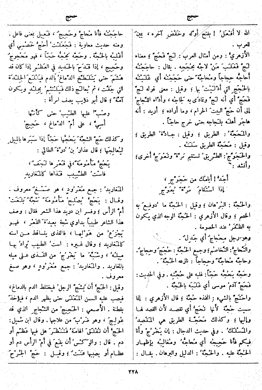 اللَّهِ لَا أَفْعَلُ بِفَتْحِ أَوَّله وخَفْضِ آخِرِهِ، يمينٌ لِلْعَرَبِ. الأَزهريُّ: وَمِنْ أَمثال الْعَرَبِ: لَجَّ فَحَجَّ؛ مَعْنَاهُ لَجَّ فَغَلَبَ مَنْ لاجَّه بحُجَجِه. يُقَالُ: حاجَجْتُه أُحاجُّه حِجاجاً ومُحاجَّةً حَتَّى حَجَجْتُه أَي غَلَبْتُه بالحُجَجِ الَّتِي أَدْلَيْتُ بها؛ وقيل: مَعْنَى قَوْلِهِ لَجَّ فَحَجَّ أَي أَنه لَجَّ وتمادَى بِهِ لَجاجُه، وأَدَّاه اللَّجاجُ إِلى أَن حَجَّ البيتَ الْحَرَامَ، وَمَا أَراده؛ أُريد: أَنه هاجَر أَهلَه بلَجاجه حَتَّى خَرَجَ حَاجًّا. والمَحَجَّةُ: الطَّرِيقُ؛ وَقِيلَ: جادَّةُ الطَّرِيقِ؛ وَقِيلَ: مَحَجَّة الطَّرِيقِ سَنَنُه. والحَجَوَّجُ: الطَّرِيقُ تَسْتَقِيمُ مَرَّةً وتَعْوَجُّ أُخْرى؛ وأَنشد: