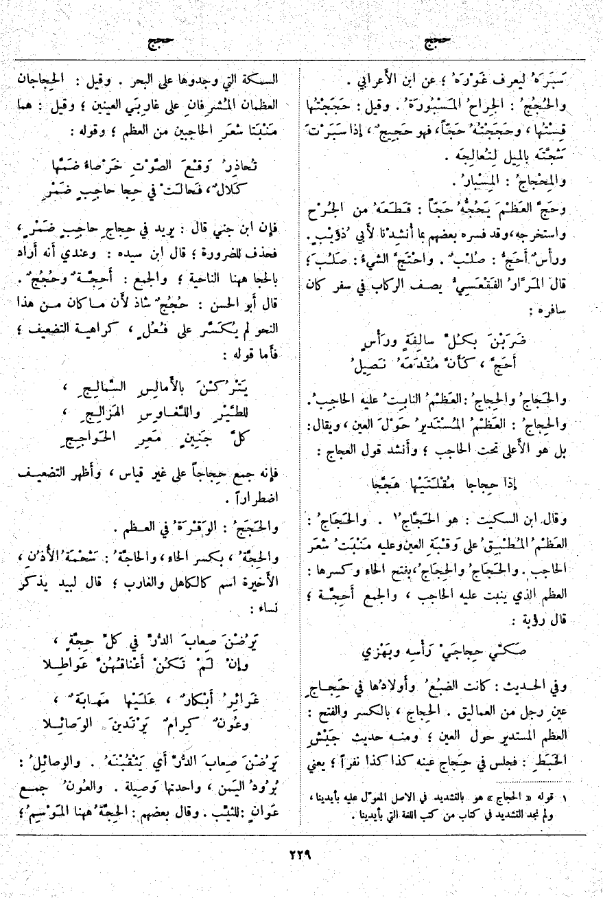 وَقَالَ ابْنُ السِّكِّيتِ: هُوَ الحَجَّاجُ «3». والحَجَاجُ: العَظْمُ المُطْبِقُ عَلَى وَقْبَةِ الْعَيْنِ وَعَلَيْهِ مَنْبَتُ شعَر الْحَاجِبِ. والحَجَاجُ والحِجَاجُ، بِفَتْحِ الحاءِ وَكَسْرِهَا: الْعَظْمُ الَّذِي يَنْبُتُ عَلَيْهِ الْحَاجِبُ، وَالْجَمْعُ أَحِجَّة؛ قَالَ رؤْبة:
