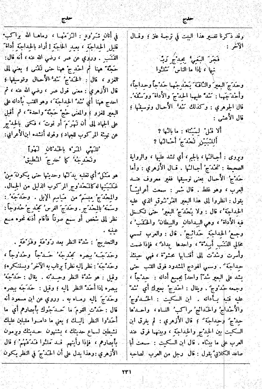 وَيُرْوَى: أَجمالُها، بِالْجِيمِ، أَي تُشَدُّ عَلَيْهَا، وَالرِّوَايَةُ الصَّحِيحَةُ: تُحْدَجُ أَجمالُها. قَالَ الأَزهري: وأَما حَدْجُ الأَحمال بِمَعْنَى تَوْسِيقِهَا فَغَيْرُ مَعْرُوفٍ عِنْدَ الْعَرَبِ، وَهُوَ غَلَطٌ. قَالَ شَمِرٌ: سَمِعْتُ أَعرابيّاً يَقُولُ: انْظُرُوا إِلى هَذَا الْبَعِيرِ الغُرْنُوقِ الَّذِي عَلَيْهِ الحِداجَةُ، قَالَ: وَلَا يُحْدَجُ البعيرُ حَتَّى تَكْمُلَ فِيهِ الأَداةُ، وَهِيَ البِدادانِ والبِطانُ والحَقَبُ، وجمعُ الحِداجَةِ حَدائِجُ. قَالَ: وَالْعَرَبُ تُسَمِّي مَخَالِي القَتَبِ أَبِدَّةً، وَاحِدُهَا بِدادٌ، فإِذا ضُمَّتْ وأُسرت وَشُدَّتْ إِلى أَقتابها مَحْشُوَّةً، فَهِيَ حِينَئِذٍ حِداجَةٌ. وَسُمِّيَ الْهَوْدَجُ الْمَشْدُودُ فَوْقَ الْقَتَبِ حَتَّى يُشَدَّ عَلَى الْبَعِيرِ شَدًّا وَاحِدًا بِجَمِيعِ أَداته: حِدْجاً، وَجَمْعُهُ حُدُوجٌ. وَيُقَالُ: احْدِجْ بَعِيرَكَ أَي شُدَّ عَلَيْهِ قَتَبَهُ بأَداته. ابْنُ السِّكِّيتِ: الحُدُوجُ والأَحْداجُ والحَدائجُ مراكبُ النساءِ، واحدُها حِدْجٌ وحِداجَةٌ؛ قَالَ الأَزهري: لَمْ يُفَرِّقِ ابْنُ السِّكِّيتِ بَيْنَ الحِدْجِ والحِداجَةِ، وَبَيْنَهُمَا فَرْقٌ عِنْدَ الْعَرَبِ عَلَى مَا بَيَّنَّاهُ. قَالَ ابْنُ السِّكِّيتِ: سَمِعْتُ أَبا صَاعِدٍ الكلابيَّ يَقُولُ: قَالَ رَجُلٌ مِنَ الْعَرَبِ لِصَاحِبِهِ فِي أَتانٍ شَرُودٍ: الْزَمْها، رَمَاهَا اللَّهُ بِرَاكِبٍ قليلِ الحِداجَةِ، بعيدِ الحاجَةِ أَراد بالحِداجَةِ أَداةَ القَتَبِ. وَرُوِيَ