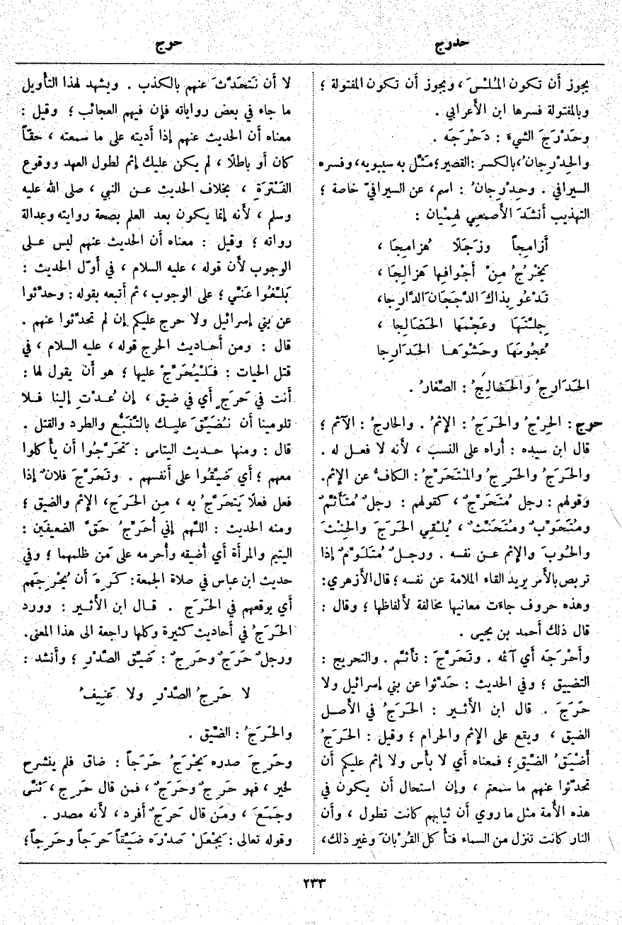 حرج: الحِرْجُ والحَرَجُ: الإِثمُ. والحارجُ: الْآثِمُ؛ قَالَ ابْنُ سِيدَهْ: أُراه عَلَى النَّسَبِ، لأَنه لَا فِعْلَ لَهُ. والحَرَجُ والحَرِجُ والمُتَحَرِّجُ: الكافُّ عَنِ الإِثم. وَقَوْلُهُمْ: رَجُلٌ مُتَحَرِّجٌ، كَقَوْلِهِمْ: رجلٌ مُتَأَثِّمٌ ومُتَحَوِّبٌ ومُتَحَنِّثٌ، يُلْقِي الحَرَجَ والحِنْثَ والحُوبَ والإِثم عَنْ نَفْسِهِ. ورجلٌ مُتَلَوِّمٌ إِذا تَرَبَّصَ بالأَمر يُرِيدُ إِلْقَاءَ الْمُلَامَةِ عَنْ نَفْسِهِ؛ قَالَ الأَزهري: وَهَذِهِ حُرُوفٌ جاءَت مَعَانِيهَا مُخَالِفَةً لأَلفاظها؛ وَقَالَ: قَالَ ذَلِكَ أَحمد بْنُ يَحْيَى. وأَحْرَجَه أَي آثَمَهُ. وتَحَرَّجَ: تأَثَّم. وَالتَّحْرِيجُ: التَّضْيِيقُ؛ وَفِي الْحَدِيثِ: