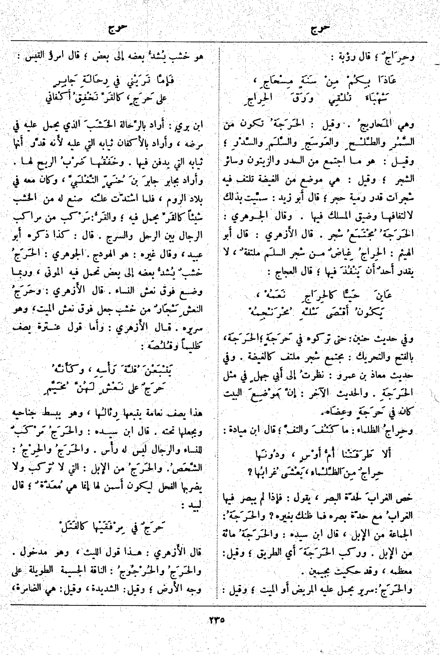 وَهِيَ المَحاريجُ. وَقِيلَ: الحَرَجَةُ تَكُونُ مِنَ السَّمُرِ والطَّلْحِ والعَوسَجِ والسَّلَمِ والسِّدْرِ؛ وَقِيلَ: هُوَ مَا اجْتَمَعَ مِنَ السَّدْرِ وَالزَّيْتُونِ وَسَائِرِ الشَّجَرِ؛ وَقِيلَ: هِيَ مَوْضِعٌ مِنَ الْغَيْضَةِ تَلْتَفُّ فِيهِ شَجَرَاتٌ قَدْرَ رَمْيَةِ حَجَرٍ؛ قَالَ أَبو زَيْدٍ: سمِّيت بِذَلِكَ لَالْتِفَافِهَا وَضِيقِ الْمَسْلَكِ فِيهَا. وَقَالَ الْجَوْهَرِيُّ: الحَرَجَةُ مُجْتَمَعُ شَجَرٍ. قَالَ الأَزهري: قَالَ أَبو الْهَيْثَمِ: الحِراجُ غِياضٌ مِنْ شَجَرِ السلَم ملتفةٌ، لَا يَقْدِرُ أَحدٌ أَن يَنْفُذَ فِيهَا؛ قَالَ الْعَجَّاجُ: